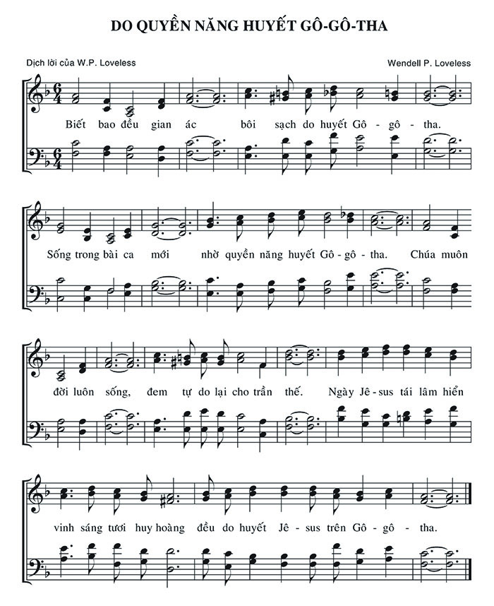 1. Biết bao đều gian ác bôi sạch do huyết Gô - gô - tha. Sống trong bài ca mới nhờ quyền năng huyết Gô - gô - tha. Chúa muôn đời luôn sống, đem tự do lại cho trần thế. Ngày Jê-sus tái lâm hiển vinh sáng tươi huy hoàng đều do huyết Jê-sus trên Gô-gô-tha.