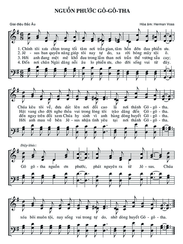 1. Chính tôi xưa chìm trong tối tăm nơi trần gian, tâm hồn đớn đau phiền ưu. Chúa kêu tôi về, đưa dắt lên nơi đồi cao là nơi thánh Gô - gô - tha. 2. Jê - sus ban quyền năng giúp tôi nay tự do, xa rời bóng mây tội ô. Hát vang cho đời nghe thỏa vui trong lòng tôi trào dâng đến Gô - gô - tha. 3. Hỡi anh đang mệt mê khổ đau trong lầm than nơi trần thế vương sầu cay; đến ngay trên đồi xem Chúa hy sinh vì anh bằng dòng huyết Gô - gô - tha. 4. Đến nơi chân Ngài dâng nỗi âu lo phiền ưu, cho đời sống vui từ đây. Hỡi anh mau về bên Jê - sus nhận tình yêu tại nơi thánh Gô-gô- tha. Điệp khúc: Gô gô tha nguồn ơn phước, phát nguyên ra từ Jê - sus. Chúa xóa bôi muôn tội, nay sống vui trong tự do, nhờ dòng huyết Gô - gô - tha.