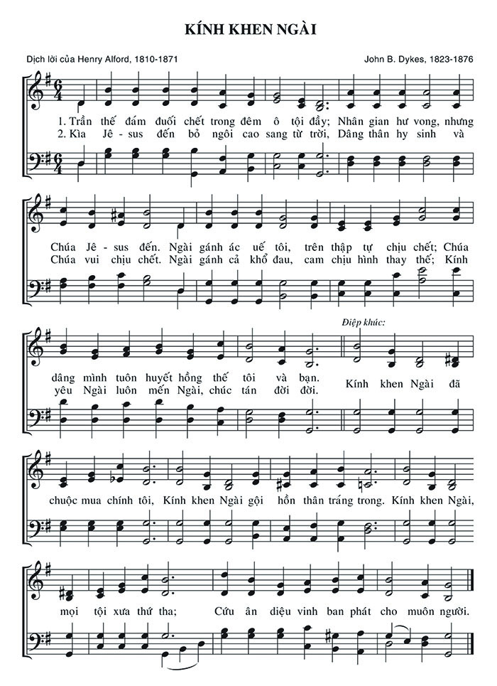 1. Trần thế đám đuối chết trong đêm ô tội đầy; Nhân gian hư vong, nhưng Chúa Jê-sus đến. Ngài gánh ác uế tôi, trên thập tự chịu chết; Chúa dâng mình tuôn huyết hồng thế tôi và bạn. chuộc mua chính tôi, Kính khen Ngài gội mọi tội xưa thứ tha; 2. Kìa Jê-sus đến bỏ ngôi cao sang từ trời, Dâng thân hy sinh và Chúa vui chịu chết. Ngài gánh cả khổ đau, cam chịu hình thay thế; Kính yêu Ngài luôn mến Ngài, chúc tán đời đời. hồn thân tráng trong. Kính khen Ngài, Cứu ân diệu vinh ban phát cho muôn người. Điệp khúc: Kính khen Ngài đã