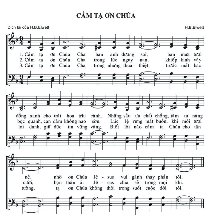 1. Cảm tạ ơn Chúa Cha ban ánh dương soi, ban mưa tươi đồng xanh cho trái hoa trĩu cành. Những sầu ưu chất chồng, tâm tư nạng nề, nhờ ơn Chúa Jê-sus vui gánh thay phần tôi. 2. Cảm tạ ơn Chúa Cha trong lúc nguy nan, khiếp kinh vây bọc quanh, can đảm không nao sờn. Lúc lệ rưng mát buồn, khi môi tươi cười, bạn thân ái Jê-sus chia sẻ trong mọi khi. 3. Cảm tạ ơn Chúa Cha trong những thua thiệt, trước mát bao lợi danh, giữ đức tin vững vàng. Biết lời nào cảm tạ Chúa cho tận tường, tạ ơn Chúa không thôi trong suốt cuộc đời tôi.