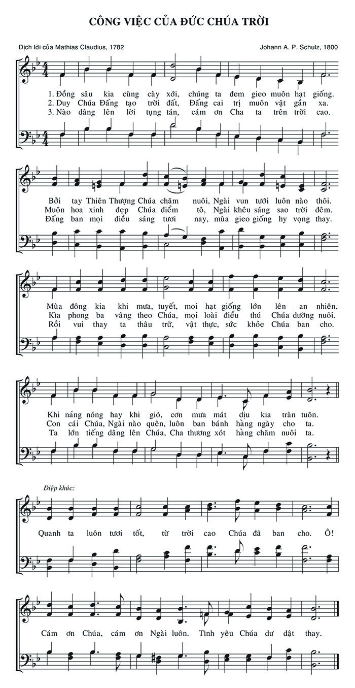 1. Đồng sâu kia cùng cày xới, chúng ta đem gieo muôn hạt giống. Bởi tay Thiên Thượng Chúa chăm nuôi, Ngài vun tưới luôn nào thôi. Mùa đông kia khi mưa, tuyết, mọi hạt giống lớn lên an nhiên. Khi nắng nóng hay khi gió, cơn mưa mát dịu kia tràn tuôn. 2. Duy Chúa Đấng tạo trời đất, Đấng cai trị muôn vật gần xa. Muôn hoa xinh đẹp Chúa điểm tô, Ngài khêu sáng sao trời đêm. Kìa phong ba vâng theo Chúa, mọi loài điểu thú Chúa dưỡng nuôi. Con cái Chúa, Ngài nào quên, luôn ban bánh hàng ngày cho ta. 3. Nào dâng lên lời tụng tán, cám ơn Cha ta trên trời cao. Đấng ban mọi điều sáng tươi nay, mùa gieo giống hy vọng thay. Rồi vui thay ta thâu trữ, vật thực, sức khỏe Chúa ban cho. Ta lớn tiếng dâng lên Chúa, Cha thương xót hàng chăm nuôi ta. Điệp khúc: Quanh ta luôn tươi tốt, từ trời cao Chúa đã ban cho. Ô! Cám ơn Chúa, cám ơn Ngài luôn. Tình yêu Chúa dư dật thay.
