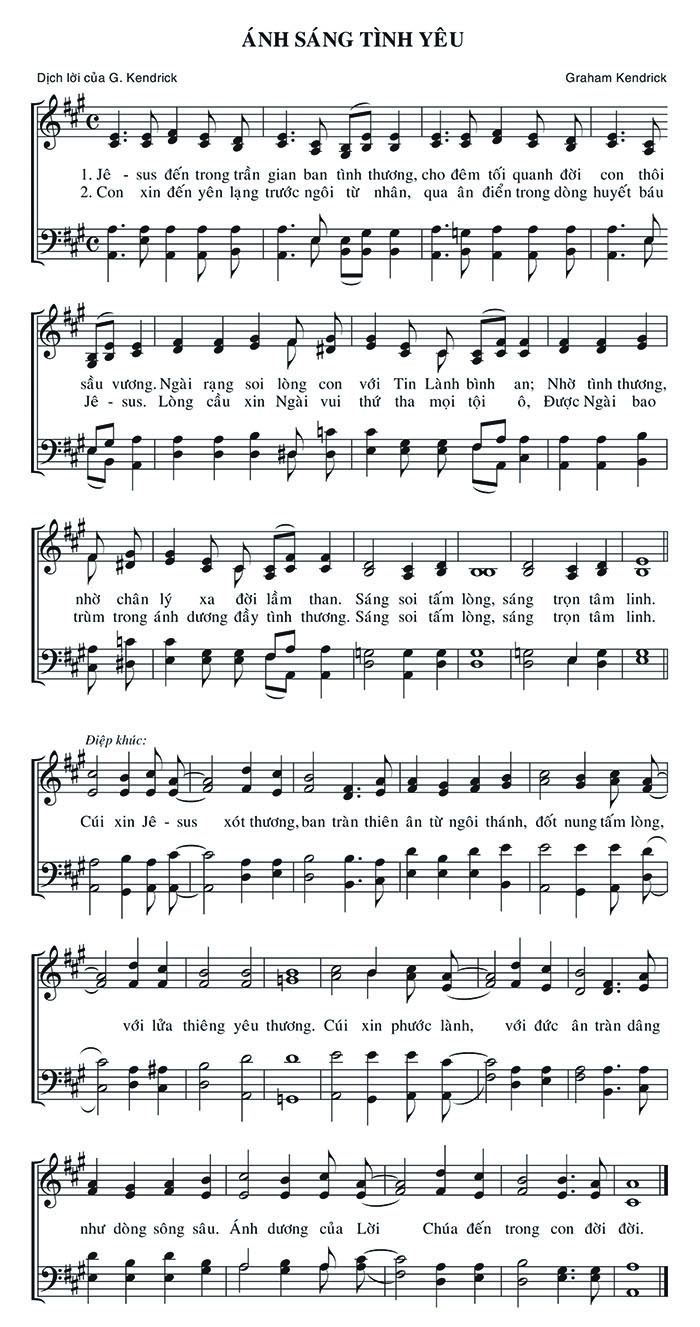 1. Jê-sus đến trong trần gian ban tình thương, cho đêm tối quanh đời con thôi sầu vương. Ngài rạng soi lòng con với Tin Lành bình an; Nhờ tình thương, nhờ chân lý xa đời lầm than. Sáng soi tấm lòng, sáng trọn tâm linh. 2. Con xin đến yên lặng trước ngôi từ nhân, qua ân điển trong dòng huyết báu Jê-sus. Lòng cầu xin Ngài vui thứ tha mọi tội ô, Được Ngài bao trùm trong ánh dương đầy tình thương. Sáng soi tấm lòng, sáng trọn tâm linh. Điệp khúc: Cúi xin Jê-sus xót thương, ban tràn thiên ân từ ngôi thánh, đốt nung tấm lòng, với lửa thiêng yêu thương. Cúi xin phước lành, với đức ân tràn dâng như dòng sông sâu. Ánh dương của Lời Chúa đến trong con đời đời.
