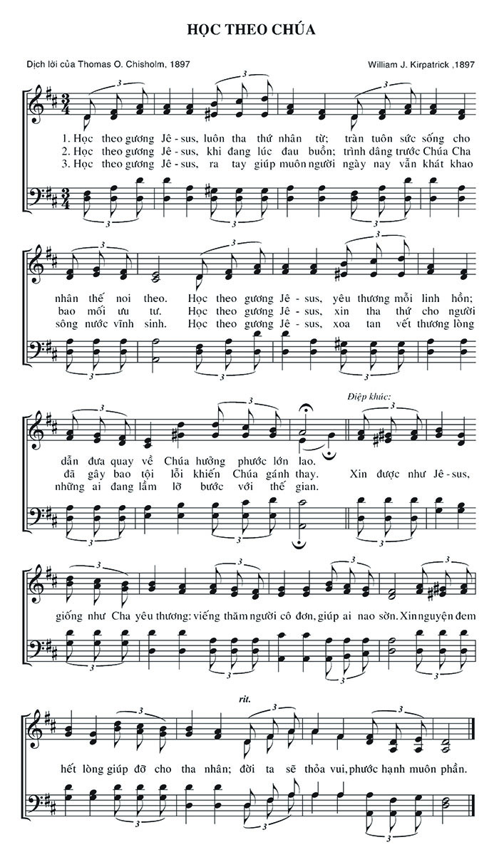 1. Học theo gương Jê-sus, luôn tha thứ nhân từ; trần tuôn sức sống cho nhân thế noi theo. Học theo gương Jê-sus, yêu thương mỗi linh hồn; 2. Học theo gương Jê-sus, khi đang lúc đau buồn; trình dâng trước Chúa Cha bao mối ưu tư. Học theo gương Jê-sus, xin tha thứ cho người 3. Học theo gương Jê-sus, ra tay giúp muôn người ngày nay vẫn khát khao sông nước vĩnh sinh. Học theo gương Jê-sus, xoa tan vết thương lòng Điệp khúc: dẫn đưa quay về Chúa hưởng phước lớn lao. đã gây bao tội lỗi khiến Chúa gánh thay. Xin được như Jê-sus, những ai đang lầm lỡ bước với thế gian. giống như Cha yêu thương: viếng thăm người cô đơn, giúp ai nao sờn. Xin nguyện đem hết lòng giúp đỡ cho tha nhân; đời ta sẽ thỏa vui, phước hạnh muôn phần.