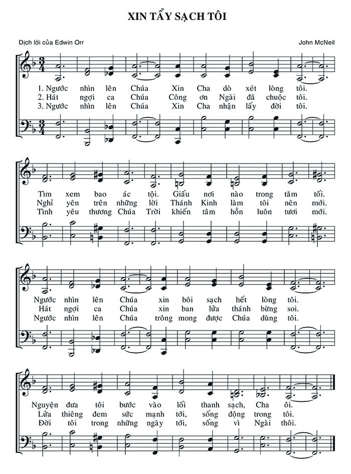 1. Ngước nhìn lên Chúa Xin Cha dò xét lòng tôi. Tìm xem bao ác tội. Giấu nơi nào trong tăm tối. Ngước nhìn lên Chúa xin bôi sạch hết lòng tôi. Nguyện đưa tôi bước vào lối thanh sạch, Cha ôi. 2. Hát ngợi ca Chúa Công ơn Ngài đã chuộc tôi. Nghỉ yên trên những lời Thánh Kinh làm tôi nên mới. Hát ngợi ca Chúa xin ban lửa thánh bừng soi. Lửa thiêng đem sức mạnh tới, sống động trong tôi. 3. Ngước nhìn lên Chúa Xin Cha nhận lấy đời tôi. Tình yêu thương Chúa Trời khiến tâm hồn luôn tươi mới. Ngước nhìn lên Chúa trông mong được Chúa dùng tôi. Đời tôi trong những ngày tới, sống vì Ngài thôi.