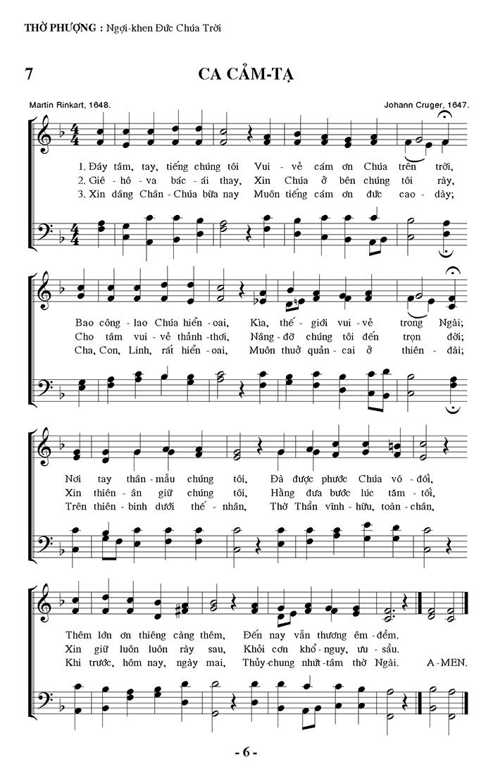 1. Đây tâm, tay, tiếng chúng tôi Vui vẻ cám ơn Chúa trên trời, Bao công lao Chúa hiển oai, Kìa, thế giới vui vẻ trong Ngài; Nơi tay thân mẫu chúng tôi, Đà được phước Chúa vô đối, Thêm lớn ơn thiêng càng thêm, Đến nay vẫn thương êm đềm. Khi trước, hôm nay, ngày mai, Thủy chung nhứt tâm thờ Ngài. 2. Giê-hô-va bác ái thay, Xin Chúa ở bên chúng tôi rày, Cho tâm vui vẻ thảnh thơi, Nâng đỡ chúng tôi đến trọn đời; Xin thiên ân giữ chúng tôi, Hằng đưa bước lúc tăm tối, Xin giữ luôn luôn rày sau, Khỏi cơn khổ nguy, ưu sầu. Khi trước, hôm nay, ngày mai, Thủy chung nhứt tâm thờ Ngài. 3. Xin dâng Chân Chúa bữa nay Muôn tiếng cám ơn đức cao dày; Cha, Con, Linh, rất hiển oai, Muôn thuở quản cai ở thiên đài; Trên thiên binh dưới thế nhân, Thờ Thần vĩnh hữu, toàn chân, Thêm lớn ơn thiêng càng thêm, Đến nay vẫn thương êm đềm. Khi trước, hôm nay, ngày mai, Thủy chung nhứt tâm thờ Ngài. Outro: A-MEN.