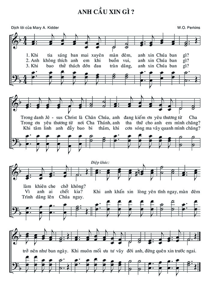 1. Khi tia sáng ban mai xuyên màn đêm, anh xin Chúa ban gì? Trong danh Jê-sus Christ là Chân Chúa, anh đang kiếm ơn yêu thương từ Cha 2. Anh không thích anh em khi buồn vui, anh xin Chúa ban gì? Trong ơn yêu thương từ nơi Cha Thánh, anh tha thứ cho anh em mình chăng? 3. Khi bao thử thách đớn đau tràn dâng, anh xin Chúa ban gì? Khi tâm linh anh đầy bao bi thảm, khi cơn sóng ma vây quanh mình chăng? Điệp khúc: làm khiên che chở không? Vì anh ai chết kia? Trình dâng lên Chúa ngay. Khi anh khấn xin lòng yên tĩnh ngay, màn đêm trở nên như ban ngày. Khi muôn mối ưu tư vây đời anh, đừng quên xin trước ngai.