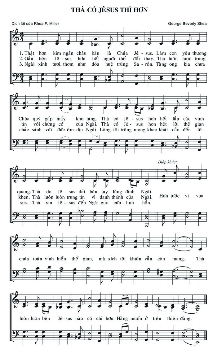 1. Thật hơn kim ngân châu báu là Chúa Jê-sus. Làm con yêu thương Chúa quý gấp mấy kho tàng. Thà có Jê-sus hơn hết lầu các vinh quang. 2. Gần bên Jê-sus hơn hết người thế đổi thay. Thà luôn luôn trung tín với chứng cớ của Ngài. Thà có Jê-sus hơn hết lời thế gian khen. 3. Ngài xinh tươi, thơm như đóa huệ trũng Sa-rôn. Tàng ong kia chưa chác sánh với đức êm dịu Ngài. Lòng tôi trông mong khao khát cần đến Jê-sus. Điệp khúc: Thà do Jê-sus dắt bàn tay lũng đinh Ngài. Hơn tước vị vua chúa toàn vinh hiển thế gian, mà xích tội khiên vẫn còn mang. Thà luôn luôn bên Jê-sus nào có chi hơn. Hằng muốn ở trên thiên đàng.