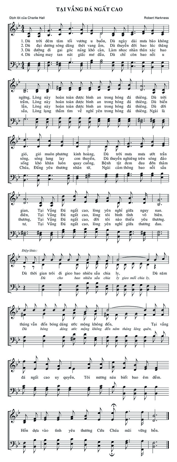 1. Dù trời đêm tăm tối vương u buồn, Dù ngày dài mưa bão không ngừng, Lòng này hoàn toàn được bình an trong bóng đá thiêng. Dù trời gió, gió muôn phương kinh hoàng, Dù trời mưa mưa ướt trần gian, Tại Vầng Đá ngất cao, lòng yên nghỉ giữa nguy nan. 2. Dù đại dương sóng dâng thét vang ẩm, Dù thuyền đời bao lúc thăng trầm, Lòng này hoàn toàn được bình an trong bóng đá thiêng. Dù biển sóng, sóng lung lay con thuyền, Dù thuyền nghiêng trên sóng đảo điên, Tại Vầng Đá ngất cao, lòng tôi bình tĩnh vô biên. 3. Dù đường đi gai góc nắng khô càn, Làm nhọc nhằn thân xác bao lần, Lòng này hoàn toàn được bình an trong bóng đá thiêng. Dù đời sống khó khăn luôn quay cuồng, Bệnh tật đem đau đớn thảm thương, Tại Vầng Đá ngất cao, đời tôi nào thiếu yêu thương. 4. Dù chẳng may tan nát giấc mơ đầu, Dù chỉ còn bao nỗi u sầu, Lòng lạng thầm tìm về nghỉ yên trong bóng đá thiêng. Ngài là Chúa, Đấng yêu thương nhân từ, Ngài cảm thông bao nỗi sầu tư, Tại Vầng Đá ngất cao, lòng yên nghỉ giữa thương đau. Điệp khúc: Dù thời gian trôi đi gieo bao nhiêu sầu chia ly, Dù năm tháng vẫn đến bóng dáng ước mộng không đến, Dù cho bao nhiêu sầu chia ly gieo mối chia ly, Dù bóng dáng ước mộng không đến năm tháng lãng quên, Tại vầng đá ngất cao uy quyền, Tôi nương náu biết bao êm đềm. Hồn dựa vào tình yêu thương Cứu Chúa mãi vững bền.