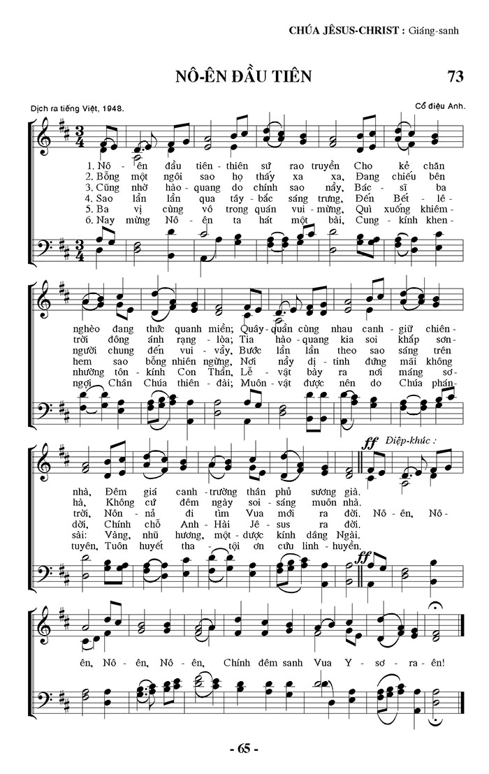1. Nô-ên đầu tiên thiên sứ rao truyền Cho kẻ chăn nghèo đang thức quanh miền; Quây-quần cùng nhau canh giữ chiên - nhà, Đêm giá canh-trường thân phủ sương già. 2. Bỗng một ngôi sao họ thấy xa xa, Đang chiếu bên trời đông ánh rạng lòa; Tia hào-quang kia soi khắp sơn - hà, Không cứ đêm ngày soi sáng muôn nhà. 3. Cũng nhờ hào-quang do chính sao nấy, Bác sĩ ba người chung đến vui vầy, Bước lần lần theo sao sáng trên trời, Nôn-nả đi tìm Vua mới ra đời. 4. Sao lần lần qua tây-bắc sáng trưng, Đến Bết-lê-hem sao bỗng nhiên ngừng, Nơi nấy dị tinh đứng mãi không dời, Chính chỗ Anh-Hài Jê-sus ra đời. 5. Ba vị cùng vô trong quán vui mừng, Quì xuống khiêm-nhường tôn-kính Con Thần, Lễ vật bày ra nơi máng Sơ-sài: Vàng, nhũ hương, một-dược kính dâng Ngài. 6. Nay mừng Nô-ên ta hát một bài, Cung-kính khen-ngợi Chân Chúa thiên-đài; Muôn vật được nên do Chúa phán-tuyên, Tuôn huyết tha tội ơn cứu linh huyền. Điệp khúc: ên, Nô-ên, Nô-ên, Chính đêm sanh Vua Y-sơ ra-ên!