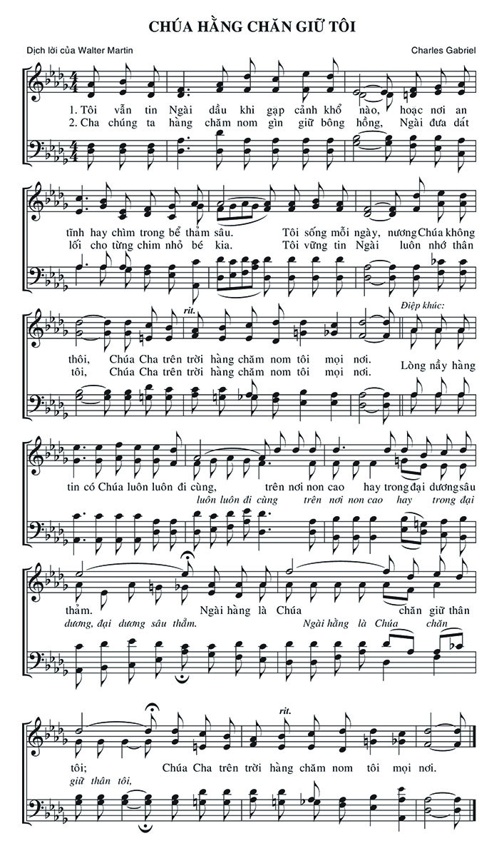 1. Tôi vẫn tin Ngài dầu khi gặp cảnh khổ nào, hoặc nơi an tĩnh hay chìm trong bể thảm sâu. Tôi sống mỗi ngày, nương Chúa không thôi, tin có Chúa luôn luôn đi cùng, trên nơi non cao hay trong đại thảm. Ngài hằng là Chúa chăn giữ thân tôi; 2. Cha chúng ta hằng chăm nom gìn giữ bông hồng, Ngài đưa dắt lối cho từng chim nhỏ bé kia. Tôi vững tin Ngài luôn nhớ thân tôi, luôn luôn đi cùng trên nơi non cao hay trong đại dương, đại dương sâu thẳm. Ngài hằng là Chúa chăn. Điệp khúc: Chúa Cha trên trời hằng chăm nom tôi mọi nơi. Lòng nầy hằng Chúa Cha trên trời hằng chăm nom tôi mọi nơi.