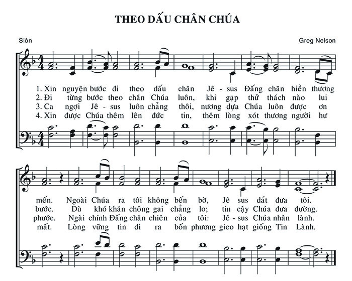 1. Xin nguyện bước đi theo dấu chân Jê-sus Đấng chăn hiền thương mến. Ngoài Chúa ra tôi không bến bờ, Jê-sus dắt đưa tôi. 2. Đi từng bước theo chân Chúa luôn, khi gặp thử thách nào lui bước. Dù khó khăn chông gai chẳng lo; tin cậy Chúa đưa đường. 3. Ca ngợi Jê-sus luôn chẳng thôi, nương dựa Chúa luôn được ơn phước. Ngài chính Đấng chăn chiên của tôi: Jê-sus Chúa nhân lành. 4. Xin được Chúa thêm lên đức tin, thêm lòng xót thương người hư mất. Lòng vững tin đi ra bốn phương gieo hạt giống Tin Lành.