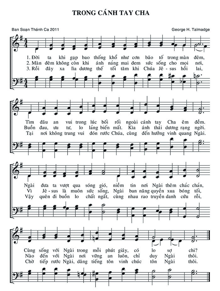 1. Đời ta khi gặp bao thống khổ như cơn bão tố trong màn đêm, Tìm đâu an vui trong lúc bối rối ngoài cánh tay Cha êm đềm. Ngài đưa ta vượt qua sóng gió, niềm tin nơi Ngài thêm chắc chắn, Cùng sống với Ngài trong mỗi phút giây, có lo sợ chi? 2. Màn đêm không còn khi ánh nắng mai đem sức sống cho mọi nơi, Buồn đau, ưu tư, lo lắng biến mất. Kìa ánh thái dương rạng ngời. Vì Jê-sus là muôn sức sống, Ngài ban năng quyền xua bóng tối, Nào đến với Ngài nơi vững an luôn, chỉ duy Ngài thôi. 3. Rồi đây xa lìa dương thế tối tăm khi Chúa Jê-sus hồi lai, Tại nơi không trung vui đón rước Chúa, cùng đến hưởng vinh quang Ngài. Vậy quên đi buồn lo chất ngất, cùng nhau rao truyền danh cứu rỗi, Chờ tiếp rước Ngài, dâng tiếng tôn vinh chúc tôn Ngài thôi.