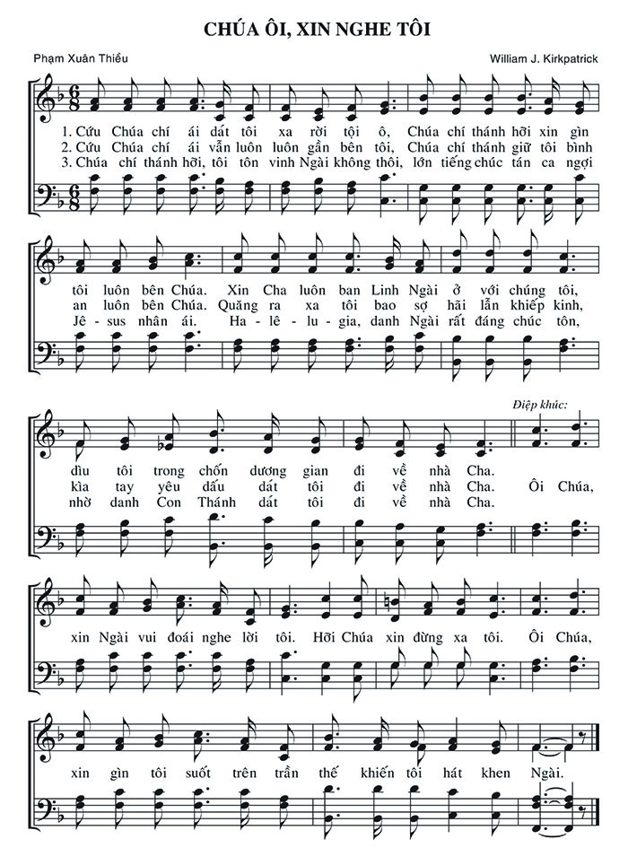 1. Cứu Chúa chí ái dát tôi xa rời tội ô, Chúa chí thánh hỡi xin gìn tôi luôn bên Chúa. Xin Cha luôn ban Linh Ngài ở với chúng tôi, dìu tôi trong chốn dương gian đi về nhà Cha. 2. Cứu Chúa chí ái vẫn luôn luôn gần bên tôi, Chúa chí thánh giữ tôi bình an luôn bên Chúa. Quăng ra xa tôi bao sợ hãi lẫn khiếp kinh, kìa tay yêu dấu dát tôi đi về nhà Cha. 3. Chúa chí thánh hỡi, tôi tôn vinh Ngài không thôi, lớn tiếng chúc tán ca ngợi Jê-sus nhân ái. Ha-lê-lu-gia, danh Ngài rất đáng chúc tôn, nhờ danh Con Thánh dát tôi đi về nhà Cha. Điệp khúc: Ôi Chúa, xin Ngài vui đoái nghe lời tôi. Hỡi Chúa xin đừng xa tôi. Ôi Chúa, xin gìn tôi suốt trên trần thế khiến tôi hát khen Ngài.