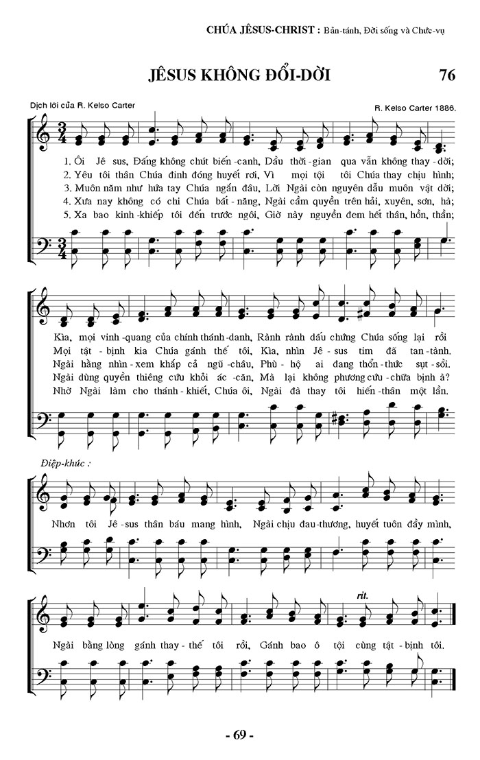 1. Ôi Jê sus, Đấng không chút biến canh, Dầu thời gian qua vẫn không thay - dời; Kìa, mọi vinh quang của chính thánh-danh, Rành rành dấu chứng Chúa sống lại rồi 2. Yêu tôi thân Chúa đinh đóng huyết rơi, Vì mọi tội tôi Chúa thay chịu hình; Mọi tật - bịnh kia Chúa gánh thế tôi, Kìa, nhìn Jê-sus tim đã tan tành. 3. Muôn năm như hứa tay Chúa ngắn đâu, Lời Ngài còn nguyên dẫu muốn vật dời; Ngài hằng nhìn - xem khắp cả ngũ châu, Phù hộ ai đang thổn thức sụt - sồi. 4. Xưa nay không có chi Chúa bất - năng, Ngài cầm quyền trên hải, xuyên, sơn, hà; Ngài dùng quyền thiêng cứu khỏi ác căn, Mà lại không phương cứu - chữa bịnh à? 5. Xa bao kinh khiếp tôi đến trước ngôi, Giờ này nguyền đem hết thân, hồn, thần; Nhờ Ngài làm cho thánh - khiết, Chúa ôi, Ngài đà thay tôi hiến thân một lần. Điệp khúc: Nhơn tôi Jê-sus thân báu mang hình, Ngài chịu đau thương, huyết tuôn đầy mình, Ngài bằng lòng gánh thay thế tôi rồi, Gánh bao ô tội cùng tật - bịnh tôi.
