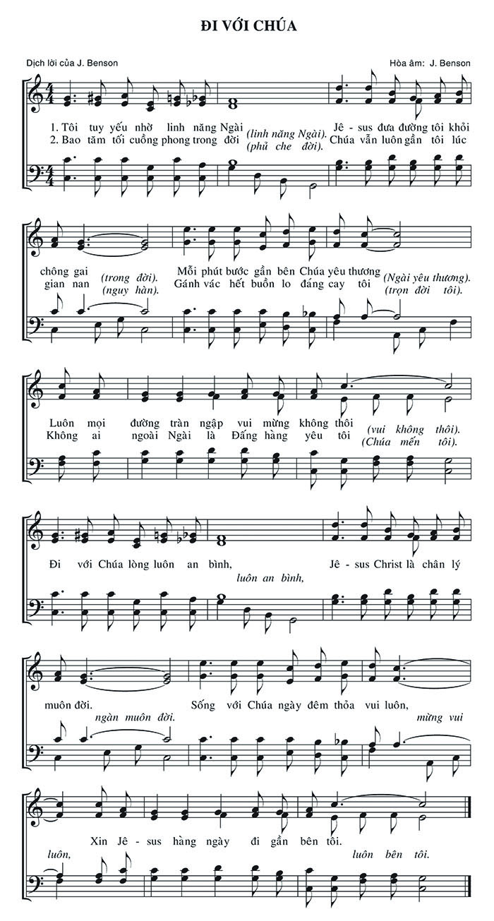 1. Tôi tuy yếu nhờ linh năng Ngài (linh năng Ngài). Jê-sus đưa đường tôi khỏi chông gai (trong đời). Mỗi phút bước gần bên Chúa yêu thương (Ngài yêu thương). Luôn mọi đường tràn ngập vui mừng không thôi (vui không thôi). 2. Bao tăm tối cuồng phong trong đời (phủ che đời). Chúa vẫn luôn gần tôi lúc gian nan (nguy hàn). Gánh vác hết buồn lo đáng cay tôi (trọn đời tôi). Không ai ngoài Ngài là Đấng hằng yêu tôi (Chúa mến tôi). Điệp khúc: Đi với Chúa lòng luôn an bình, luôn an bình, Jê-sus Christ là chân lý muôn đời. Sống với Chúa ngày đêm thỏa vui luôn, mừng vui ngàn muôn đời. Xin Jê-sus hàng ngày đi gần bên tôi. luôn, luôn bên tôi.