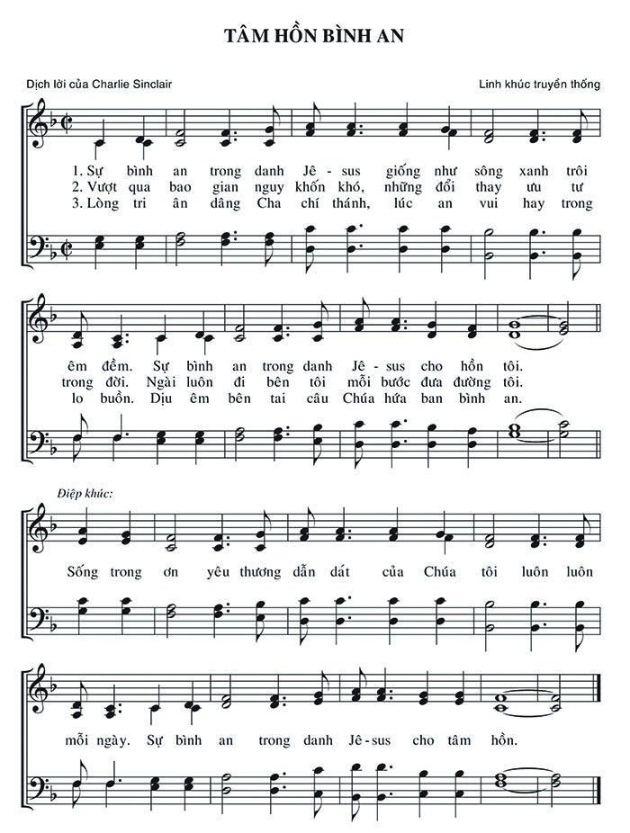 1. Sự bình an trong danh Jê-sus giống như sông xanh trôi êm đềm. Sự bình an trong danh Jê-sus cho hồn tôi. 2. Vượt qua bao gian nguy khốn khó, những đổi thay ưu tư trong đời. Ngài luôn đi bên tôi mỗi bước đưa đường tôi. 3. Lòng tri ân dâng Cha chí thánh, lúc an vui hay trong lo buồn. Dịu êm bên tai câu Chúa hứa ban bình an. 4. Sống trong ơn yêu thương dẫn dắt của Chúa tôi luôn luôn mỗi ngày. Sự bình an trong danh Jê-sus cho tâm hồn. Điệp khúc: Sống trong ơn yêu thương dẫn dắt của Chúa tôi luôn luôn mỗi ngày. Sự bình an trong danh Jê-sus cho tâm hồn.