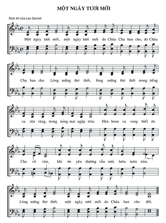 1. Một ngày tươi mới, một ngày tươi mới do Chúa Cha ban cho, do Chúa Cha ban cho. Lòng mừng thơ thới, lòng mừng thơ thới trong tiếng ca rộn ràng, trong nắng mai ngập tràn. Hân hoan ca vang biết ơn Cha vô vàn, khi ơn yêu thương vẫn mãi luôn tuôn tràn. Lòng mừng thơ thới, một ngày tươi mới do Chúa ban cho đời.