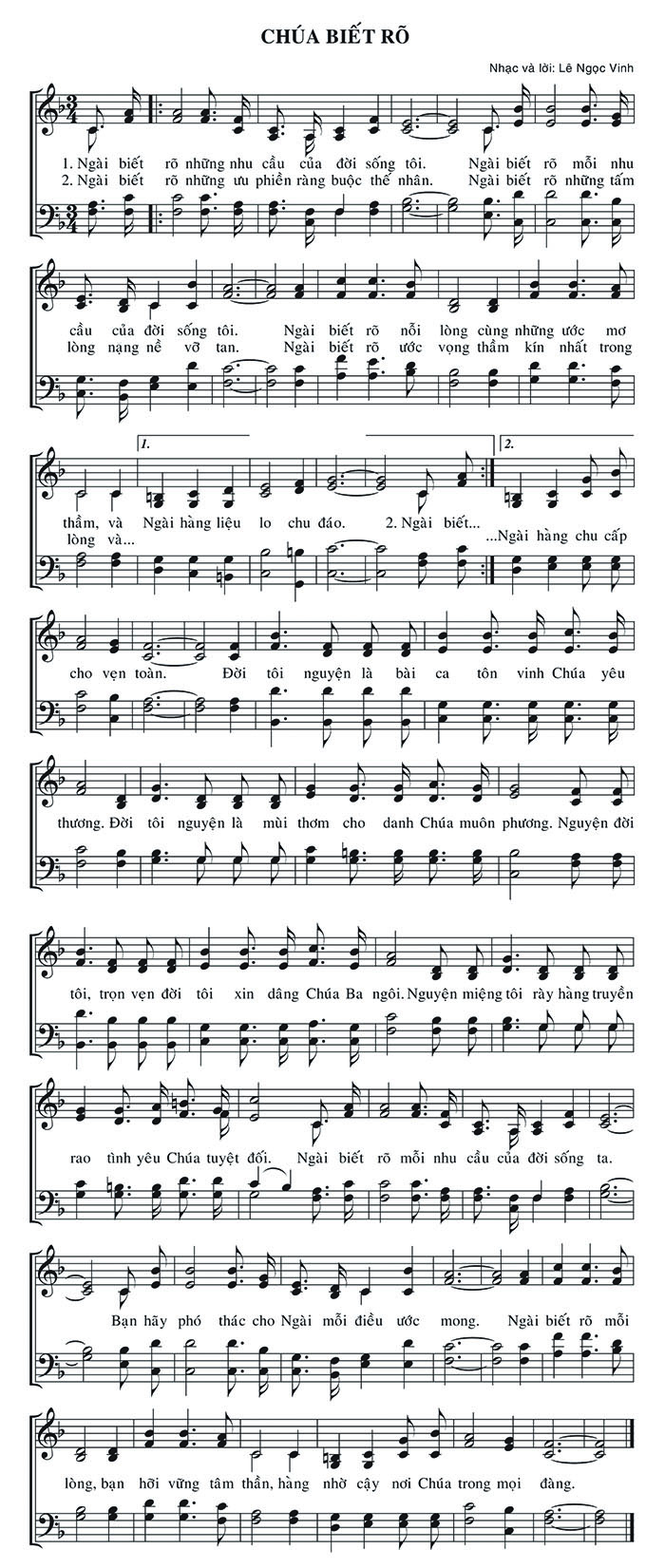 1. Ngài biết rõ những nhu cầu của đời sống tôi. Ngài biết rõ mỗi nhu cầu của đời sống tôi. Ngài biết rõ nỗi lòng cùng những ước mơ thầm, và Ngài hàng liệu lo chu đáo. Đời tôi nguyện là bài ca tôn vinh Chúa yêu thương. Đời tôi nguyện là mùi thơm cho danh Chúa muôn phương. Nguyện đời tôi, trọn vẹn đời tôi xin dâng Chúa Ba ngôi. Nguyện miệng tôi rày hàng truyền rao tình yêu Chúa tuyệt đối. Ngài biết rõ mỗi nhu cầu của đời sống ta. Bạn hãy phó thác cho Ngài mỗi điều ước mong. Ngài biết rõ mỗi lòng, bạn hỡi vững tâm thần, hàng nhờ cậy nơi Chúa trong mọi đàng. 2. Ngài biết rõ những ưu phiền ràng buộc thế nhân. Ngài biết rõ những tấm lòng nặng nề vỡ tan. Ngài biết rõ ước vọng thầm kín nhất trong lòng và... Ngài biết... Ngài hàng chu cấp cho vẹn toàn. Đời tôi nguyện là bài ca tôn vinh Chúa yêu thương. Đời tôi nguyện là mùi thơm cho danh Chúa muôn phương. Nguyện đời tôi, trọn vẹn đời tôi xin dâng Chúa Ba ngôi. Nguyện miệng tôi rày hàng truyền rao tình yêu Chúa tuyệt đối. Ngài biết rõ mỗi nhu cầu của đời sống ta. Bạn hãy phó thác cho Ngài mỗi điều ước mong. Ngài biết rõ mỗi lòng, bạn hỡi vững tâm thần, hàng nhờ cậy nơi Chúa trong mọi đàng.
