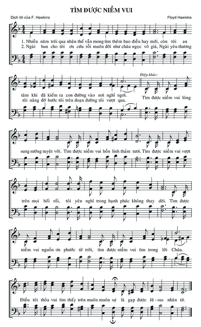 1. Nhiều năm trôi qua nhân thế vẫn mong tìm thêm bao điều hay mới, còn tôi an tâm khi đã kiếm ra con đường vào nơi nghỉ ngơi. Điều tôi thỏa vui tìm thấy trên muôn muôn sự là gạp được Jê-sus nhân từ. 2. Ngài ban cho tôi ơn cứu rỗi muôn đời như châu ngọc vô giá, Ngài yêu thương tôi nâng đỡ bước tôi trên đoạn đường tôi vượt qua. Điều tôi thỏa vui tìm thấy trên muôn muôn sự là gạp được Jê-sus nhân từ. Điệp khúc: Tìm được niềm vui lòng sung sướng tuyệt vời. Tìm được niềm vui hồn linh thám tươi. Tìm được niềm vui vượt trên mọi bối rối, tôi yên nghỉ trong hạnh phúc không thay dời. Tìm được niềm vui nguồn ơn phước từ trời, tìm được niềm vui tìm trong lời Chúa.