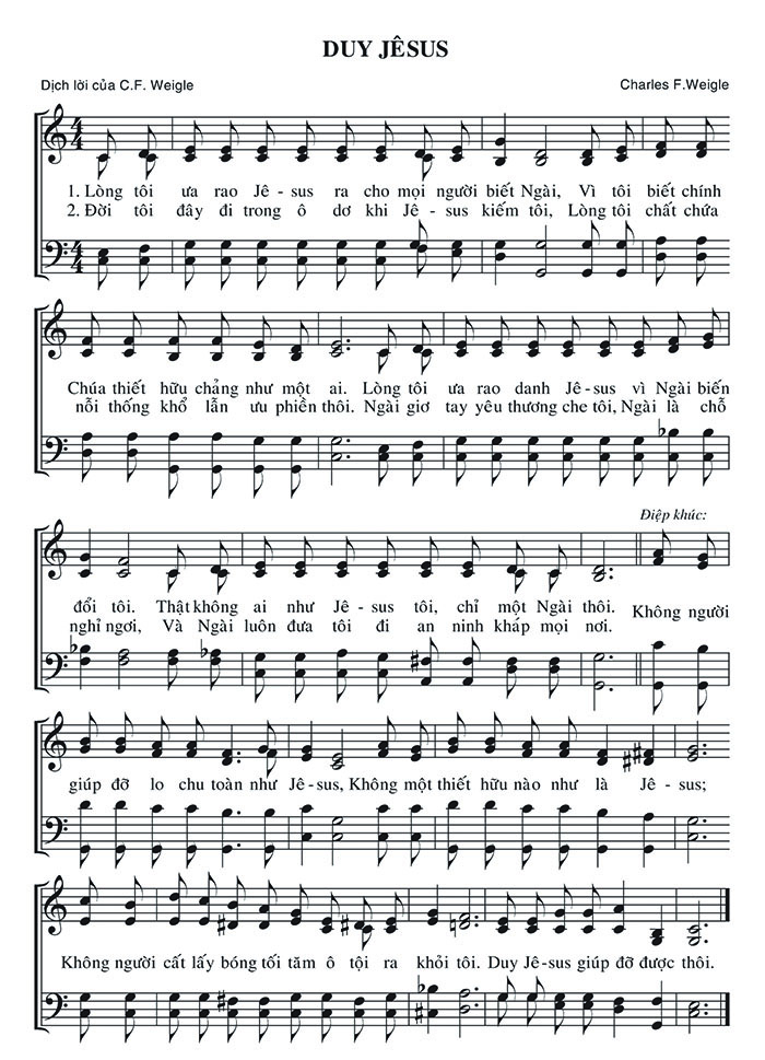 1. Lòng tôi ưa rao Jê-sus ra cho mọi người biết Ngài, Vì tôi biết chính Chúa thiết hữu chẳng như một ai. Lòng tôi ưa rao danh Jê-sus vì Ngài biến đổi tôi. 2. Đời tôi đây đi trong ô dơ khi Jê-sus kiếm tôi, Lòng tôi chất chứa nỗi thống khổ lẫn ưu phiền thôi. Ngài giơ tay yêu thương che tôi, Ngài là chỗ nghỉ ngơi, Và Ngài luôn đưa tôi đi an ninh khắp mọi nơi. Điệp khúc: Thật không ai như Jê-sus tôi, chỉ một Ngài thôi. Không người giúp đỡ lo chu toàn như Jê-sus, Không một thiết hữu nào như là Jê-sus; Không người cất lấy bóng tối tăm ô tội ra khỏi tôi. Duy Jê-sus giúp đỡ được thôi.