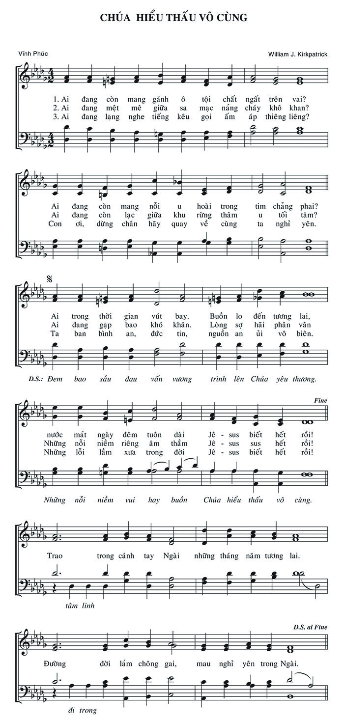 1. Ai đang còn mang gánh ô tội chất ngất trên vai? Ai đang còn mang nỗi u hoài trong tim chẳng phai? Ai trong thời gian vút bay. Buồn lo đến tương lai, nước mắt ngày đêm tuôn dài Jê-sus biết hết rồi! Trao trong cánh tay Ngài những tháng năm tương lai. Đường đời lắm chông gai, mau nghỉ yên trong Ngài. 2. Ai đang mệt mê giữa sa mạc nắng cháy khô khan? Ai đang còn lạc giữa khu rừng thâm u tối tăm? Ai đang gặp bao khó khăn. Lòng sợ hãi phân vân Những nỗi niềm riêng âm thầm Jê-sus biết hết rồi! Trao trong cánh tay Ngài những tháng năm tương lai. Đường đời lắm chông gai, mau nghỉ yên trong Ngài. 3. Ai đang lắng nghe tiếng kêu gọi ấm áp thiêng liêng? Con ơi, dừng chân hãy quay về cùng ta nghỉ yên. Ta ban bình an, đức tin, nguồn an ủi vô biên. Những lỗi lầm xưa trong đời Jê-sus biết hết rồi! Trao trong cánh tay Ngài những tháng năm tương lai. Đường đời lắm chông gai, mau nghỉ yên trong Ngài. Điệp khúc: Đem bao sầu đau vẫn vương trình lên Chúa yêu thương. Những nỗi niềm vui hay buồn Chúa hiểu thấu vô cùng. tâm linh đi trong