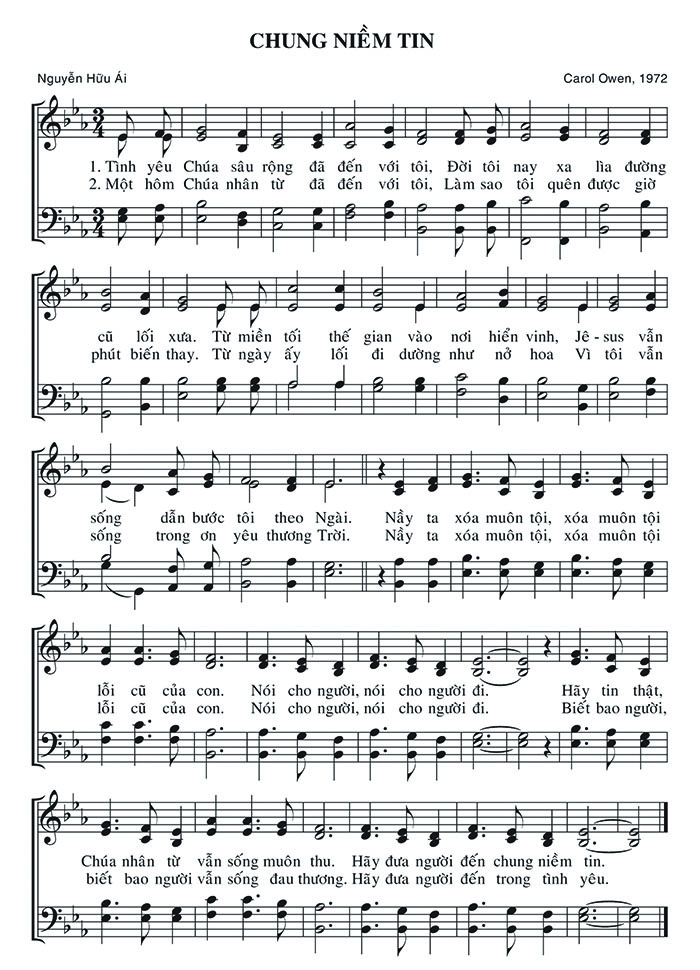 1. Tình yêu Chúa sâu rộng đã đến với tôi, Đời tôi nay xa lìa đường cũ lối xưa. Từ miền tối thế gian vào nơi hiển vinh, Jê-sus vẫn sống dẫn bước tôi theo Ngài. Nầy ta xóa muôn tội, xóa muôn tội lỗi cũ của con. Nói cho người, nói cho người đi. Chúa nhân từ vẫn sống muôn thu. Hãy đưa người đến chung niềm tin. 2. Một hôm Chúa nhân từ đã đến với tôi, Làm sao tôi quên được giờ phút biến thay. Từ ngày ấy lối đi dường như nở hoa Vì tôi vẫn sống trong ơn yêu thương Trời. Nầy ta xóa muôn tội, xóa muôn tội lỗi cũ của con. Nói cho người, nói cho người đi. Hãy tin thật, biết bao người vẫn sống đau thương. Hãy đưa người đến trong tình yêu.
