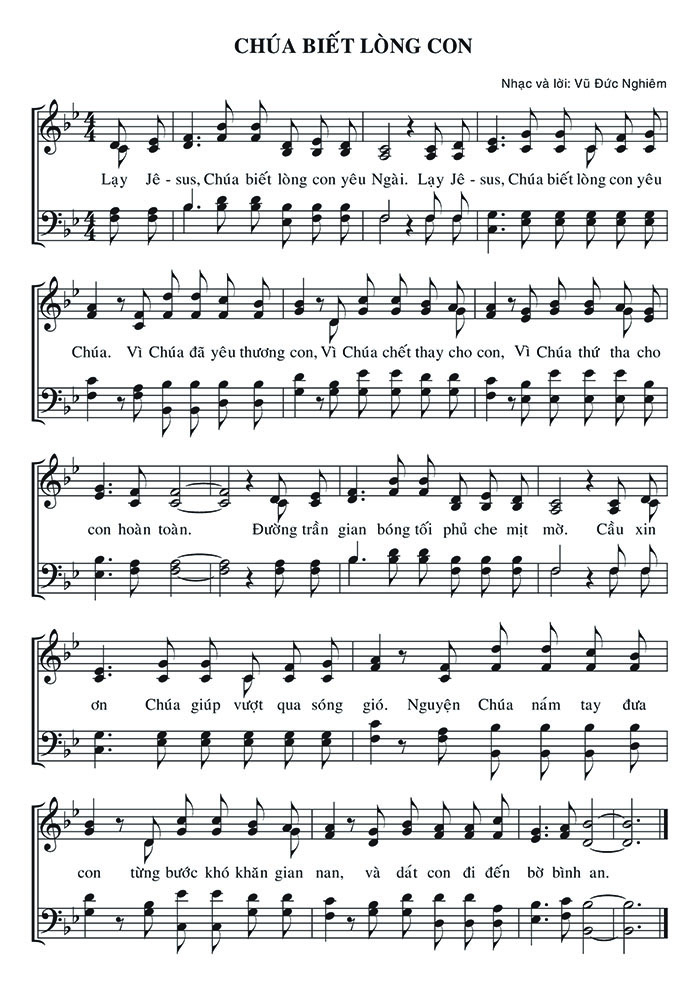 1. Lạy Jê-sus, Chúa biết lòng con yêu Ngài. Lạy Jê-sus, Chúa biết lòng con yêu Chúa. Vì Chúa đã yêu thương con, Vì Chúa chết thay cho con, Vì Chúa thứ tha cho con hoàn toàn. Đường trần gian bóng tối phủ che mịt mờ. Cầu xin ơn Chúa giúp vượt qua sóng gió. Nguyện Chúa nắm tay đưa con từng bước khó khăn gian nan, và dắt con đi đến bờ bình an.