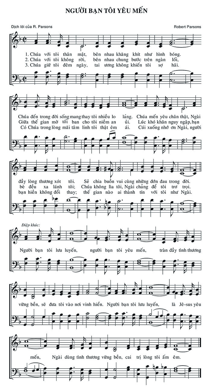1. Chúa với tôi thân mật, bên nhau khăng khít như hình bóng. Chúa đến trong đời sống mang thay tôi nhiều lo láng. Chúa mến yêu chân thật, Ngài đầy lòng thương xót tôi. Sẻ chia buồn vui cùng những đớn đau trong đời. 2. Chúa với tôi không rời, bên nhau chung bước trên ngàn lối, Giữa thế gian mờ tối ban cho tôi niềm an ủi. Lúc khó khăn nguy ngập, bạn bè đều xa lánh tôi; Chúa không lìa tôi, Ngài chẳng để tôi trơ trọi. 3. Chúa giữ tôi đêm ngày, tai ương không khiến tôi sợ hãi. Có Chúa trong lòng mãi tâm linh tôi thật êm ái. Cúi xuống nhớ ơn Ngài, người bạn hiền không đổi thay; thế gian nào ai thành tín với tôi như Ngài. Điệp khúc: Người bạn tôi lưu luyến, người bạn tôi yêu mến, tràn đầy tình thương vững bền, sẽ đưa tôi vào nơi vinh hiển. Người bạn tôi lưu luyến, là Jê-sus yêu mến, Ngài dùng tình thương vững bền, cai trị lòng tôi ấm êm.