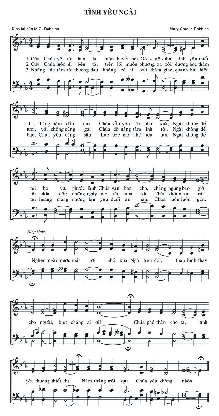 1. Cứu Chúa yêu tôi bao la, tuôn huyết nơi Gô - gô - tha, tình yêu thiết tha, tháng năm dần qua. Chúa vẫn yêu tôi như xưa, Ngài không để tôi bơ vơ, phước lành Chúa vẫn ban cho, chẳng ngưng bao giờ. 2. Cứu Chúa luôn đi bên tôi trên lối muôn phương xa xôi, đường hoa thắm tươi, với chông cùng gai. Chúa đỡ nâng tâm linh tôi, Ngài không để tôi đơn côi; những ngày gió rét mưa rơi, Chúa không xa rời. 3. Những lúc tâm tôi thương đau, không có ai vui thâm giao, quạnh hiu biết bao, Chúa yêu càng sâu. Lúc ước mơ như tiêu tan, Ngài không để tôi hoang mang, những lần yếu đuối ăn năn, Chúa luôn luôn gần. 4. Nghẹn ngào nước mắt rơi nhớ xưa Ngài trên đồi, thập hình thay cho người, biết chăng ai ơi! Chúa phó thân cho ta, tình yêu thương thiết tha Năm tháng trôi qua Chúa yêu không nhòa. Điệp khúc: Nghẹn ngào nước mắt rơi nhớ xưa Ngài trên đồi, thập hình thay cho người, biết chăng ai ơi! Chúa phó thân cho ta, tình yêu thương thiết tha Năm tháng trôi qua Chúa yêu không nhòa.