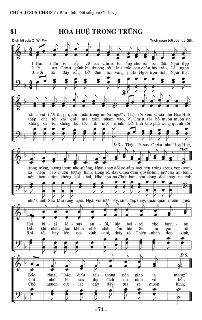 1. Bạn thân tôi, ấy Jê sus Christ, lo lắng cho tôi trọn đời, Ngài đẹp xinh, vui tươi thay, quán quân trong muôn người; Thật tôi xem Chúa như Hoa Huệ trong trũng, hương thơm nhẹ nhàng, Ngài thay đổi ác tâm nầy nên trắng trong vẹn toàn; Hồi bi ai Jê sus an ủi, lúc bối rối cho bình an. Bảo rằng, "Mọi điều sầu thống nên giao ta mang;" 2. Jê sus Christ gánh bị thương tôi, lau ráo bao châu lụy trào, Là ngọn tháp che tôi khi quỉ ma xâm phạm vào; Vì Christ, tôi bỏ muôn muôn sự, xa ném bao nhiêu tượng hình, Lòng tôi đây Chúa đem quyền linh giữ cho an bình; Dầu khi nhân gian khinh chê chán, lắm lúc Sa tan gạt tôi. Chỉ nhờ Jê sus đạt đích an ninh vô hồi; 3. Hồi tôi đây sống bởi đức tin, vâng ý Ba Ngôi trọn tình, Ngài thật không xa tôi, không bỏ tôi đi một mình; Lửa linh bao phủ xung quanh tôi nên bổn tâm không bồi hồi, Nhờ ma-na Chúa ban, hồn đang đói thấy no rồi; Rồi tôi bay lên nơi vinh quí, thấy rõ Thiên nhan đẹp xinh. Chỗ nguồn cực lạc đầy dẫy tua ra muốn hình; Điệp khúc: Thật Jê-sus Christ như Hoa Huệ, như chính Sao Mai rạng ngời, Ngài vui tươi bấy, xinh đẹp thay, quán quân muôn người!