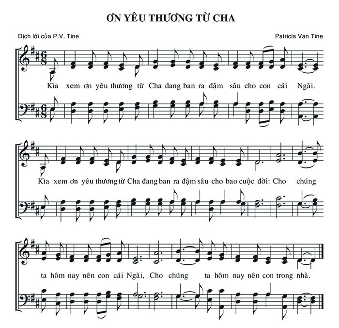 1. Kìa xem ơn yêu thương từ Cha đang ban ra đậm sâu cho con cái Ngài. Kìa xem ơn yêu thương từ Cha đang ban ra đậm sâu cho bao cuộc đời: Cho chúng ta hôm nay nên con cái Ngài, Cho chúng ta hôm nay nên con trong nhà.