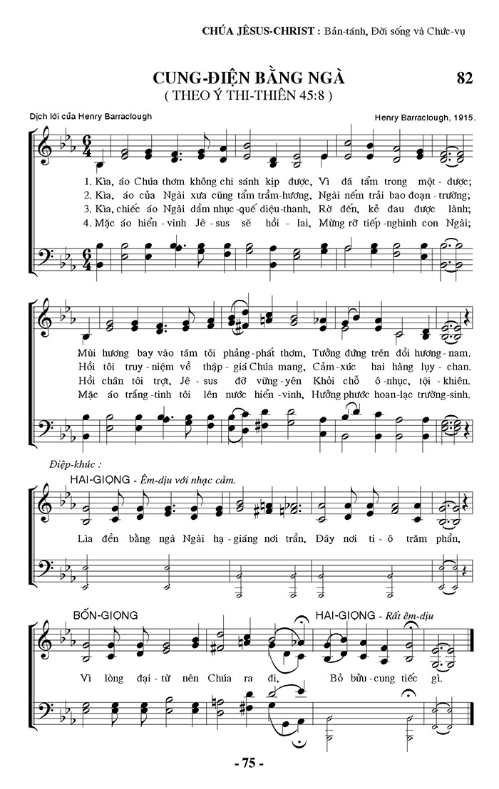 1. Kìa, áo Chúa thơm không chỉ sánh kịp được, Vì đã tẩm trong một - dược; Mùi hương bay vào tâm tôi phảng-phất thơm, Tưởng đứng trên đồi hương - nam. 2. Kìa, áo của Ngài xưa cũng tẩm trầm-hương, Ngài nếm trải bao đoạn - trường; Hồi tôi truy - niệm về thập - giá Chúa mang, Cảm-xúc hai hàng lụy - chan. 3. Kìa, chiếc áo Ngài dầm nhục quế diệu-thanh, Rờ đến, kẻ đau được lành; Hồi chân tôi trợt, Jêsus đỡ vững yên Khỏi chỗ ô-nhục, tội - khiên. 4. Mặc áo hiển - vinh Jê-sus sẽ hồi lai, Mừng rỡ tiếp -nghinh con Ngài; Mặc áo trắng-tinh tôi lên nước hiển vinh, Hưởng phước hoan lạc trường-sinh. Điệp khúc: Lìa đền bằng ngà Ngài hạ - giáng nơi trần, Đây nơi ti - ô trăm phần, Vì lòng đại - từ nên Chúa ra đi, Bỏ bửu - cung tiếc gì.