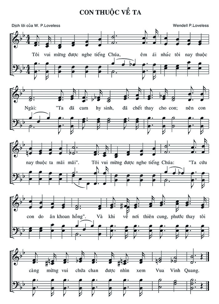 1. Tôi vui mừng được nghe tiếng Chúa, êm ái nhác tôi nay thuộc Ngài: "Ta đã cam hy sinh, đã chết thay cho con; nên con nay thuộc ta mãi mãi". Tôi vui mừng được nghe tiếng Chúa: "Ta cứu con do ân khoan hồng". Và khi về nơi thiên cung, phước thay tôi càng mừng vui chứa chan được nhìn xem Vua Vinh Quang.