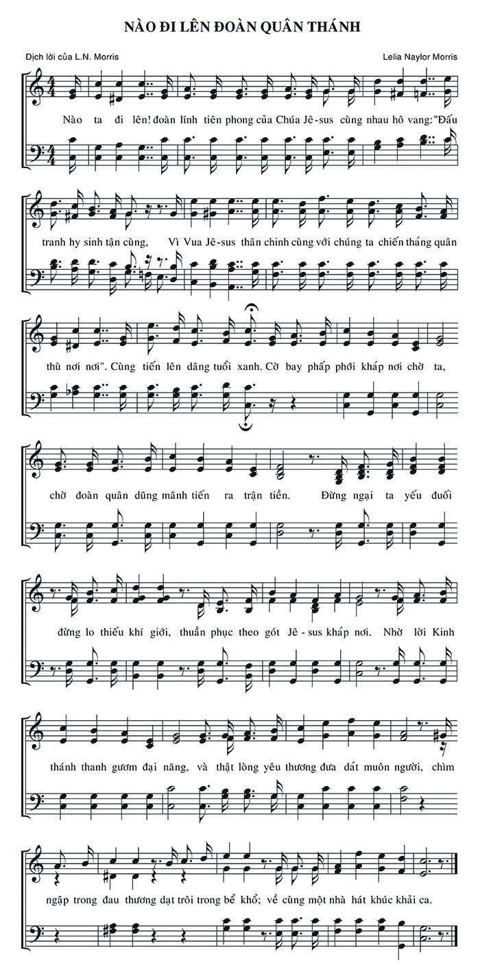 1. Nào ta đi lên! đoàn lính tiên phong của Chúa Jê-sus cùng nhau hô vang: "Đấu tranh hy sinh tận cùng, Vì Vua Jê-sus thân chinh cùng với chúng ta chiến thắng quân thù nơi nơi". Cùng tiến lên dâng tuổi xanh. Cờ bay phấp phới khắp nơi chờ ta, chờ đoàn quân dũng mãnh tiến ra trận tiền. Đừng ngại ta yếu đuối đừng lo thiếu khí giới, thuần phục theo gót Jê-sus khắp nơi. Nhờ lời Kinh thánh thanh gươm đại năng, và thật lòng yêu thương đưa dắt muôn người, chìm ngập trong đau thương dạt trôi trong bể khổ; về cùng một nhà hát khúc khải ca.