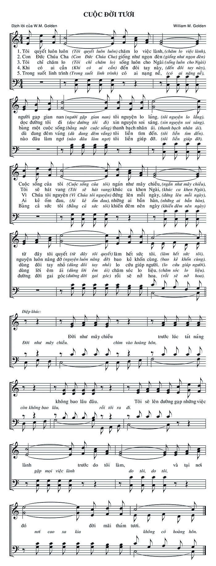 1. Tôi quyết luôn luôn chăm lo việc lành, người gặp gian nan tôi nguyện lo lắng. Cuộc sống của tôi ngán như mây chiều, từ đây tôi quyết làm hết sức tôi. 2. Con Đức Chúa Cha giống như ngọn đèn, dọc đường tôi đi xin nguyện soi sáng. Tôi sẽ hát vang khúc ca khen Ngài, nguyện luôn nâng đỡ bao kẻ khốn cùng. 3. Tôi chỉ chăm lo sống luôn cho Ngài, bằng một cuộc sống thanh bạch nhân ái. Vì Chúa tôi nguyện đứng lên mỗi ngày, dùng đôi tay nhỏ lo cứu giúp người. 4. Khi có (ai cần) đến đôi tay này, dù đang đêm vắng tôi liền tìm đến. Ai kẻ ốm đau, những ai bần hàn, dùng lời êm ái chăm sóc lo liệu. 5. Trong suốt linh trình có ai nặng nề, nào đâu làm ngơ tôi liền giúp đỡ. Bằng cả sức tôi khiến đêm nên ngày, đường đời gai góc rồi sẽ nở hoa. Điệp khúc: Đời như mây chiều trước lúc tát nắng, Đời như mây chiều chìm vào hoàng hôn, còn không bao lâu đâu. Tôi sẽ lên đường gặp những việc lành trước do tôi làm, và tại nơi gặp mọi việc lành do tôi, do tôi, đó nơi cao xa kia đời mãi thắm tươi. không có hoàng hôn.
