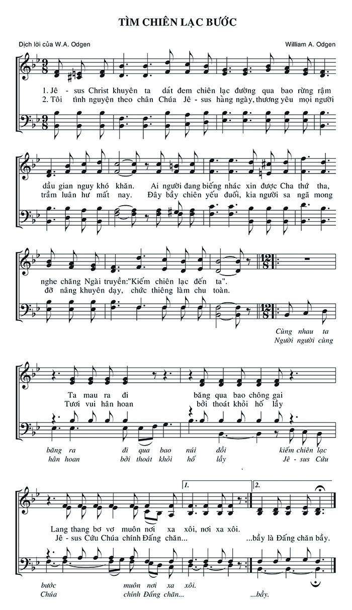 1. Jê-sus Christ khuyên ta dắt đem chiên lạc đường qua bao rừng rậm dầu gian nguy khó khăn. Ai người đang biếng nhác xin được Cha thứ tha, nghe chăng Ngài truyền: "Kiếm chiên lạc đến ta". Ta mau ra đi băng qua bao chông gai băng ra đi qua bao núi đồi Lang thang bơ vơ muôn nơi xa xôi, nơi xa xôi. 2. Tôi tình nguyện theo chân Chúa Jê-sus hàng ngày, thương yêu mọi người trầm luân hư mất nay. Đây bầy chiên yếu đuối, kia người sa ngã mong đỡ nâng khuyên dạy, chức thiêng làm chu toàn. Tươi vui hân hoan bởi thoát khỏi hố lầy hân hoan bởi thoát khỏi hố lầy Jê-sus Cứu Chúa chính Đấng chăn... bầy là Đấng chăn bầy. Điệp khúc: Cùng nhau ta Người người cùng kiếm chiên lạc Jê-sus Cứu bước Chúa muôn nơi xa xôi. chính Đấng chăn... bầy.