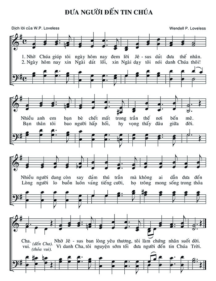 1. Nhờ Chúa giúp tôi ngày hôm nay đem lời Jê-sus dắt đưa thế nhân. Nhiều anh em bạn bè chết mất trong trần thế nơi bến mê. Nhiều người đang còn say đám thú trần mà không ai dẫn đưa đến Cha. 2. Ngày hôm nay xin Ngài dắt lối, xin Ngài dạy tôi nói danh Chúa thôi! Bạn thân tôi bao người hấp hối, hy vọng thấy đâu giữa đời. Lòng người lo buồn luôn váng tiếng cười, họ trông mong sống trong thỏa vui. Điệp khúc: Nhờ Jê-sus ban lòng yêu thương, tôi làm chứng nhân suốt đời. Vì danh Cha, tôi nguyện sớm tối đưa người đến tin Chúa Trời.
