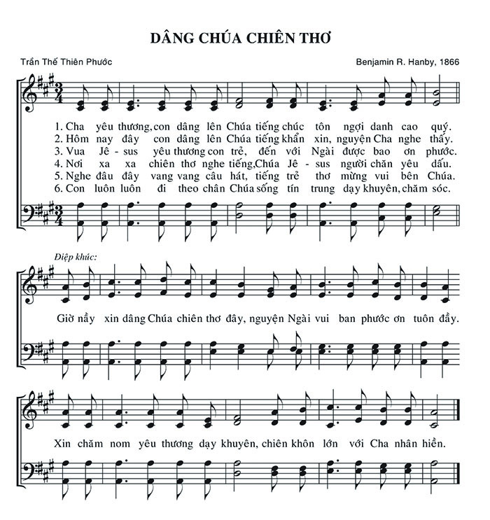 1. Cha yêu thương, con dâng lên Chúa tiếng chúc tôn ngợi danh cao quý. 2. Hôm nay đây con dâng lên Chúa tiếng khẩn xin, nguyện Cha nghe thấy. 3. Vua Jê-sus yêu thương con trẻ, đến với Ngài được bao ơn phước. 4. Nơi xa xa chiên thơ nghe tiếng, Chúa Jê-sus người chăn yêu dấu. 5. Nghe đâu đây vang vang câu hát, tiếng trẻ thơ mừng vui bên Chúa. 6. Con luôn luôn đi theo chân Chúa sống tín trung dạy khuyên, chăm sóc. Điệp khúc: Giờ nầy xin dâng Chúa chiên thơ đây, nguyện Ngài vui ban phước ơn tuôn đầy. Xin chăm nom yêu thương dạy khuyên, chiên khôn lớn với Cha nhân hiền.