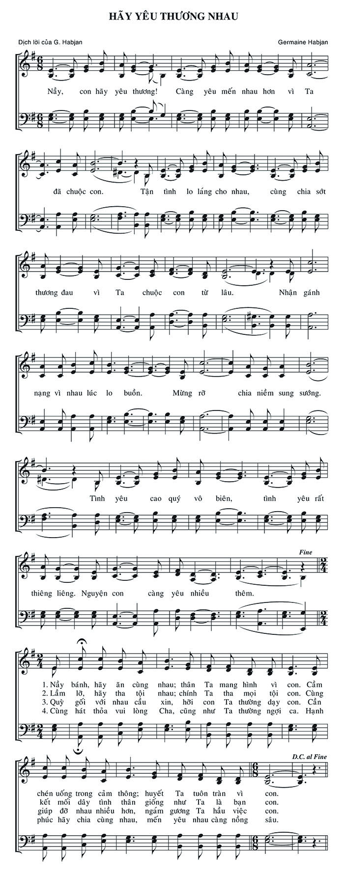 1. Nầy, con hãy yêu thương! Càng yêu mến nhau hơn vì Ta đã chuộc con. Tận tình lo lắng cho nhau, cùng chia sớt thương đau vì Ta chuộc con từ lâu. Nhận gánh nặng vì nhau lúc lo buồn. Mừng rỡ chia niềm sung sướng. Tình yêu cao quý vô biên, tình yêu rất thiêng liêng. Nguyện con càng yêu nhiều thêm. Nầy bánh, hãy ăn cùng nhau; thân Ta mang hình vì con. Cầm chén uống trong cảm thông; huyết Ta tuôn tràn vì con. 2. Nầy, con hãy yêu thương! Càng yêu mến nhau hơn vì Ta đã chuộc con. Tận tình lo lắng cho nhau, cùng chia sớt thương đau vì Ta chuộc con từ lâu. Nhận gánh nặng vì nhau lúc lo buồn. Mừng rỡ chia niềm sung sướng. Tình yêu cao quý vô biên, tình yêu rất thiêng liêng. Nguyện con càng yêu nhiều thêm. Lầm lỡ, hãy tha tội nhau; chính Ta tha mọi tội con. Cùng kết mối dây tình thân giống như Ta là bạn con. 3. Nầy, con hãy yêu thương! Càng yêu mến nhau hơn vì Ta đã chuộc con. Tận tình lo lắng cho nhau, cùng chia sớt thương đau vì Ta chuộc con từ lâu. Nhận gánh nặng vì nhau lúc lo buồn. Mừng rỡ chia niềm sung sướng. Tình yêu cao quý vô biên, tình yêu rất thiêng liêng. Nguyện con càng yêu nhiều thêm. Quỳ gối với nhau cầu xin, hỡi con Ta thường dạy con. Cần giúp đỡ nhau nhiều hơn, ngắm gương Ta hầu việc con. 4. Nầy, con hãy yêu thương! Càng yêu mến nhau hơn vì Ta đã chuộc con. Tận tình lo lắng cho nhau, cùng chia sớt thương đau vì Ta chuộc con từ lâu. Nhận gánh nặng vì nhau lúc lo buồn. Mừng rỡ chia niềm sung sướng. Tình yêu cao quý vô biên, tình yêu rất thiêng liêng. Nguyện con càng yêu nhiều thêm. Cùng hát thỏa vui lòng Cha, cũng như Ta thường ngợi ca. Hạnh phúc hãy chia cùng nhau, mến yêu nhau càng nồng sâu.