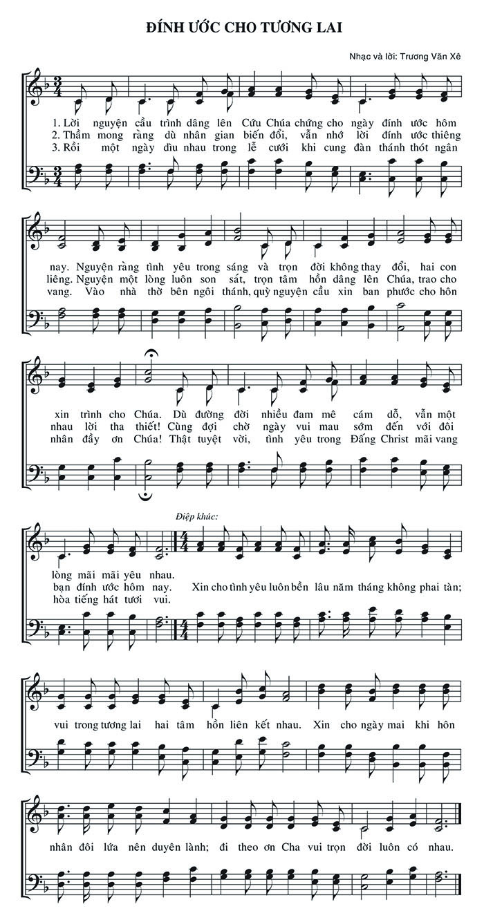 1. Lời nguyện cầu trình dâng lên Cứu Chúa chứng cho ngày đính ước hôm nay. Nguyện ràng tình yêu trong sáng và trọn đời không thay đổi, hai con xin trình cho Chúa. Dù đường đời nhiều đam mê cám dỗ, vẫn một lòng mãi mãi yêu nhau. 2. Thầm mong rằng dù nhân gian biến đổi, vẫn nhớ lời đính ước thiêng liêng. Nguyện một lòng luôn son sát, trọn tâm hồn dâng lên Chúa, trao cho nhau lời tha thiết! Cùng đợi chờ ngày vui mau sớm đến với đôi bạn đính ước hôm nay. Xin cho tình yêu luôn bền lâu năm tháng không phai tàn; 3. Rồi một ngày dìu nhau trong lễ cưới khi cung đàn thánh thót ngân vang. Vào nhà thờ bên ngôi thánh, quỳ nguyện cầu xin ban phước cho hôn nhân đầy ơn Chúa! Thật tuyệt vời, tình yêu trong Đấng Christ mãi vang hòa tiếng hát tươi vui. Điệp khúc: vui trong tương lai hai tâm hồn liên kết nhau. Xin cho ngày mai khi hôn nhân đôi lứa nên duyên lành; đi theo ơn Cha vui trọn đời luôn có nhau.