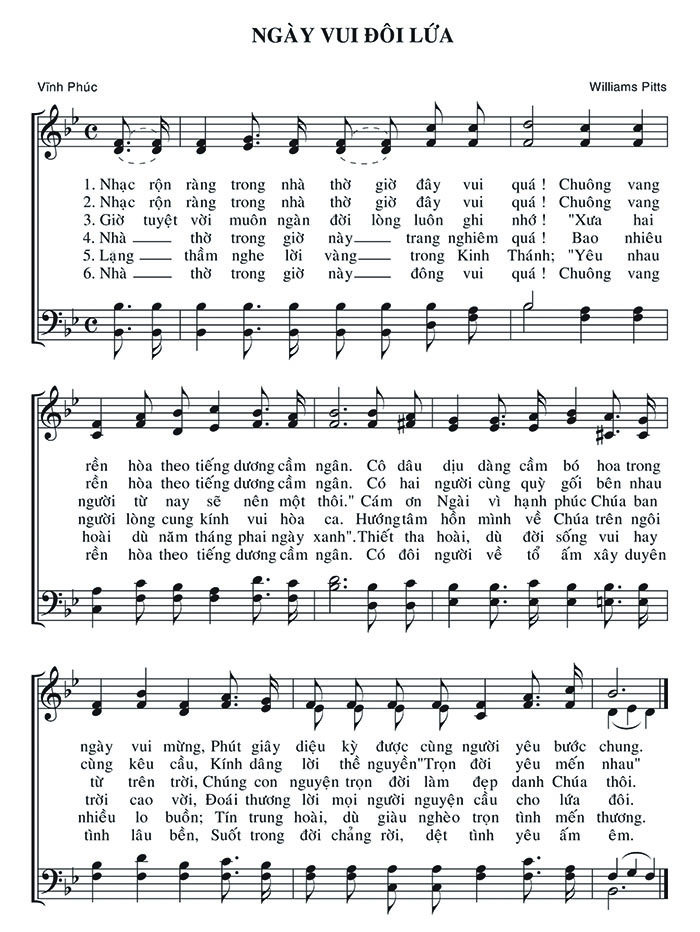 1. Nhạc rộn ràng trong nhà thờ giờ đây vui quá! Chuông vang rền hòa theo tiếng dương cầm ngân. Cô dâu dịu dàng cầm bó hoa trong ngày vui mừng, Phút giây diệu kỳ được cùng người yêu bước chung. 2. Nhạc rộn ràng trong nhà thờ giờ đây vui quá! Chuông vang rền hòa theo tiếng dương cầm ngân. Có hai người cùng quỳ gối bên nhau cùng kêu cầu, Kính dâng lời thề nguyền"Trọn đời yêu mến nhau" 3. Giờ tuyệt vời muôn ngàn đời lòng luôn ghi nhớ! "Xưa hai người từ nay sẽ nên một thôi." Cám ơn Ngài vì hạnh phúc Chúa ban từ trên trời, Chúng con nguyện trọn đời làm đẹp danh Chúa thôi. 4. Nhà thờ trong giờ này trang nghiêm quá! Bao nhiêu người lòng cung kính vui hòa ca. Hướng tâm hồn mình về Chúa trên ngôi trời cao vời, Đoái thương lời mọi người nguyện cầu cho lứa đôi. 5. Lặng thầm nghe lời vàng trong Kinh Thánh; "Yêu nhau hoài dù năm tháng phai ngày xanh". Thiết tha hoài, dù đời sống vui hay nhiều lo buồn; Tín trung hoài, dù giàu nghèo trọn tình mến thương. 6. Nhà thờ trong giờ này đông vui quá! Chuông vang rền hòa theo tiếng dương cầm ngân. Có đôi người về tổ ấm xây duyên tình lâu bền, Suốt trong đời chẳng rời, dệt tình yêu ấm êm.