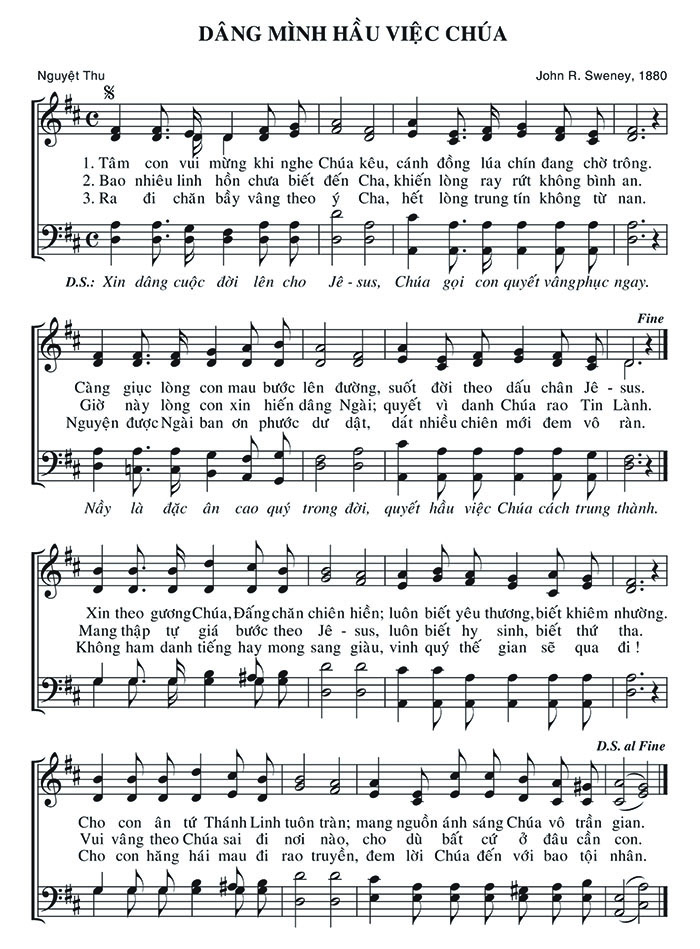 1. Tâm con vui mừng khi nghe Chúa kêu, cánh đồng lúa chín đang chờ trông. Càng giục lòng con mau bước lên đường, suốt đời theo dấu chân Jê-sus. Xin theo gương Chúa, Đấng chăn chiên hiền; luôn biết yêu thương, biết khiêm nhường. Cho con ân tứ Thánh Linh tuôn tràn; mang nguồn ánh sáng Chúa vô trần gian. 2. Bao nhiêu linh hồn chưa biết đến Cha, khiến lòng ray rứt không bình an. Giờ này lòng con xin hiến dâng Ngài; quyết vì danh Chúa rao Tin Lành. Mang thập tự giá bước theo Jê-sus, luôn biết hy sinh, biết thứ tha. Vui vâng theo Chúa sai đi nơi nào, cho dù bất cứ ở đâu cần con. 3. Ra đi chăn bẩy vâng theo ý Cha, hết lòng trung tín không từ nan. Nguyện được Ngài ban ơn phước dư dật, dắt nhiều chiên mới đem vô ràn. Không ham danh tiếng hay mong sang giàu, vinh quý thế gian sẽ qua đi! Cho con hăng hái mau đi rao truyền, đem lời Chúa đến với bao tội nhân. chorus. Xin dâng cuộc đời lên cho Jê-sus, Chúa gọi con quyết vâng phục ngay. Nầy là đặc ân cao quý trong đời, quyết hầu việc Chúa cách trung thành.