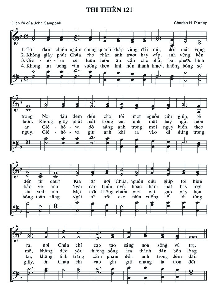1. Tôi đăm chiêu ngắm chung quanh khắp vùng đồi núi, đôi mắt vọng trông. Nơi đâu đem đến cho tôi một nguồn cứu giúp, sẽ đến từ đâu? Kìa từ nơi Chúa, nguồn cứu giúp tôi hiện ra, nơi Chúa chí cao tạo sáng non sông vũ trụ. 2. Không giây phút Chúa cho chân anh trượt hay vấp, anh vững bền luôn. Không giây phút mát trông coi anh mệt hay ngủ, luôn bảo vệ anh. Ngài nào buồn ngủ, hoặc nhám mắt hay mệt mê, không đức yêu thương bồng ẩm thánh dân bên lòng. 3. Giê-hô-va sẽ luôn luôn ân cần che phủ, ban phước bình an. Giê-hô-va đỡ nâng anh trong mọi nguy biến, theo sát cạnh anh. Mặt trời không chiếu giọt gát gao gây họa tai, không ánh trăng xâm phạm đến anh trong đêm dài. 4. Không tai ương vấn vương theo linh hồn thanh khiết, không bóng sợ nguy. Giê-hô-va giữ anh khi ra vào đi đứng trong bóng toàn năng. Ngài từ trời cao nhìn xuống lối đi từng giây, ơn Chúa chí cao gìn giữ chúng ta trọn đời.