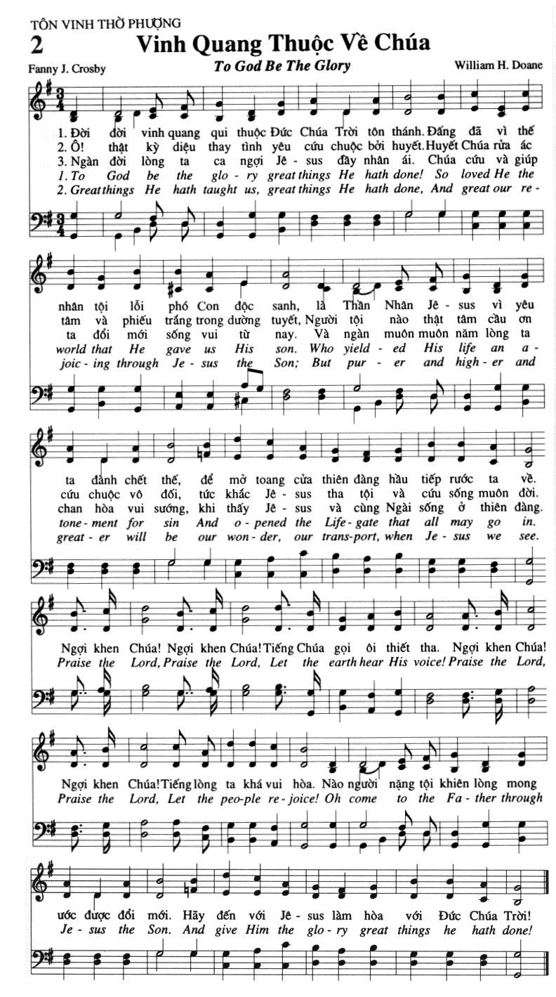 1. Đời đời vinh quang qui thuộc Đức Chúa Trời tôn thánh. Đấng đã vì thế nhân tội lỗi phó Con độc sanh, là Thần Nhân Jê-sus vì yêu tâm và phiếu trắng trong dường tuyết, Người tội nào thật tâm cầu ơn ta đổi mới sống vui từ nay. Và ngàn muôn muôn năm lòng ta ta đành chết thế, để mở toang cửa thiên đàng hầu tiếp rước ta về. 2. Ô! thật kỳ diệu thay tình yêu cứu chuộc bởi huyết. Huyết Chúa rửa ác cứu chuộc vô đối, tức khắc Jê-sus tha tội và cứu sống muôn đời. 3. Ngàn đời lòng ta ca ngợi Jê-sus đây nhân ái. Chúa cứu và giúp chan hòa vui sướng, khi thấy Jê-sus và cùng Ngài sống ở thiên đàng. Điệp khúc: Ngợi khen Chúa! Ngợi khen Chúa! Tiếng Chúa gọi ôi thiết tha. Ngợi khen Chúa! Ngợi khen Chúa! Tiếng lòng ta khá vui hòa. Nào người nặng tội khiên lòng mong ước được đổi mới. Hãy đến với Jê-sus làm hòa với Đức Chúa Trời!