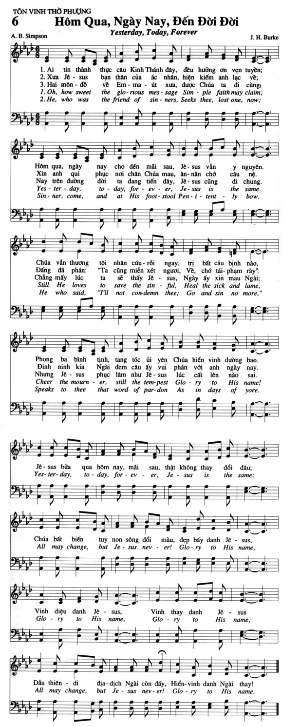 1. Ai tin thành thực câu Kinh Thánh đây, đều hưởng ơn vẹn tuyền; Oh, how sweet the glorious message Simple faith may claim; Hôm qua, ngày nay cho đến mãi sau, Jê-sus vẫn y nguyên. Yesterday, today, for ever, Je-sus is the same; Chúa vẫn thương tội nhân cứu rỗi ngay, trị bất câu bịnh nào, Still He loves to save the sinful, Heal the sick and lame, Phong ba bình tịnh, tang tóc ủi yên Chúa hiển vinh dường bao. Cheer the mourner, still the tempest Glory to His name! Jê-sus bữa qua hôm nay, mãi sau, thật không thay đổi đâu; Yesterday, today, for ever, Jesus is the same; Chúa bất biến tuy non sông đổi màu, đẹp bấy danh Jê-sus, All may change, but Jesus never! Glo-ry to His name, Vinh diệu danh Je-sus, Vinh thay danh Je-sus Glory to His name, Glory to His name; Dẫu thiên di địa-dịch Ngài còn đấy, Hiển-vinh danh Ngài thay! All may change, but Jesus never! Glory to His name. 2. Xưa Jê-sus bạn thân của ác nhân, hiện kiếm anh lạc về; He, who was the friend of sinners, Seeks thee, lost one, now; Xin anh qui phục nơi chân Chúa mau, ăn năn chớ câu nệ. Sinner, come, and at His footstool Penitent ly bow. Đấng đã phán: "Ta cũng miễn xét ngươi, Về, chớ tái phạm rày". He who said, "I'll not condemn thee; Go and sin no more," Đinh ninh kia Ngài đem câu ấy vui phán với anh ngày nay. Speaks to thee that word of pardon As in days of yore. Jê-sus bữa qua hôm nay, mãi sau, thật không thay đổi đâu; Yesterday, today, for ever, Jesus is the same; Chúa bất biến tuy non sông đổi màu, đẹp bấy danh Jê-sus, All may change, but Jesus never! Glo-ry to His name, Vinh diệu danh Je-sus, Vinh thay danh Je-sus Glory to His name, Glory to His name; Dẫu thiên di địa-dịch Ngài còn đấy, Hiển-vinh danh Ngài thay! All may change, but Jesus never! Glory to His name. 3. Hai môn đồ về Em-ma-út xưa, được Chúa ta đi cùng: Nay trên đường đời ta đang tiến đây, Jê-sus cũng đi chung. Chẳng mấy lúc ta sẽ thấy Jê-sus, Ngày ấy xin mau Ngài; Nhưng Jê-sus phục lâm như Jê-sus lúc cất lên nào sai. Jê-sus bữa qua hôm nay, mãi sau, thật không thay đổi đâu; Yesterday, today, for ever, Jesus is the same; Chúa bất biến tuy non sông đổi màu, đẹp bấy danh Jê-sus, All may change, but Jesus never! Glo-ry to His name, Vinh diệu danh Je-sus, Vinh thay danh Je-sus Glory to His name, Glory to His name; Dẫu thiên di địa-dịch Ngài còn đấy, Hiển-vinh danh Ngài thay! All may change, but Jesus never! Glory to His name.