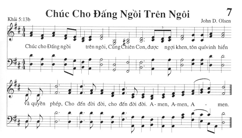 1. Chúc cho Đấng ngồi trên ngôi, Cùng Chiên Con, được ngợi khen, tôn quí vinh hiển và quyền phép, Cho đến đời đời, cho đến đời đời. A-men, A-men, A-men.