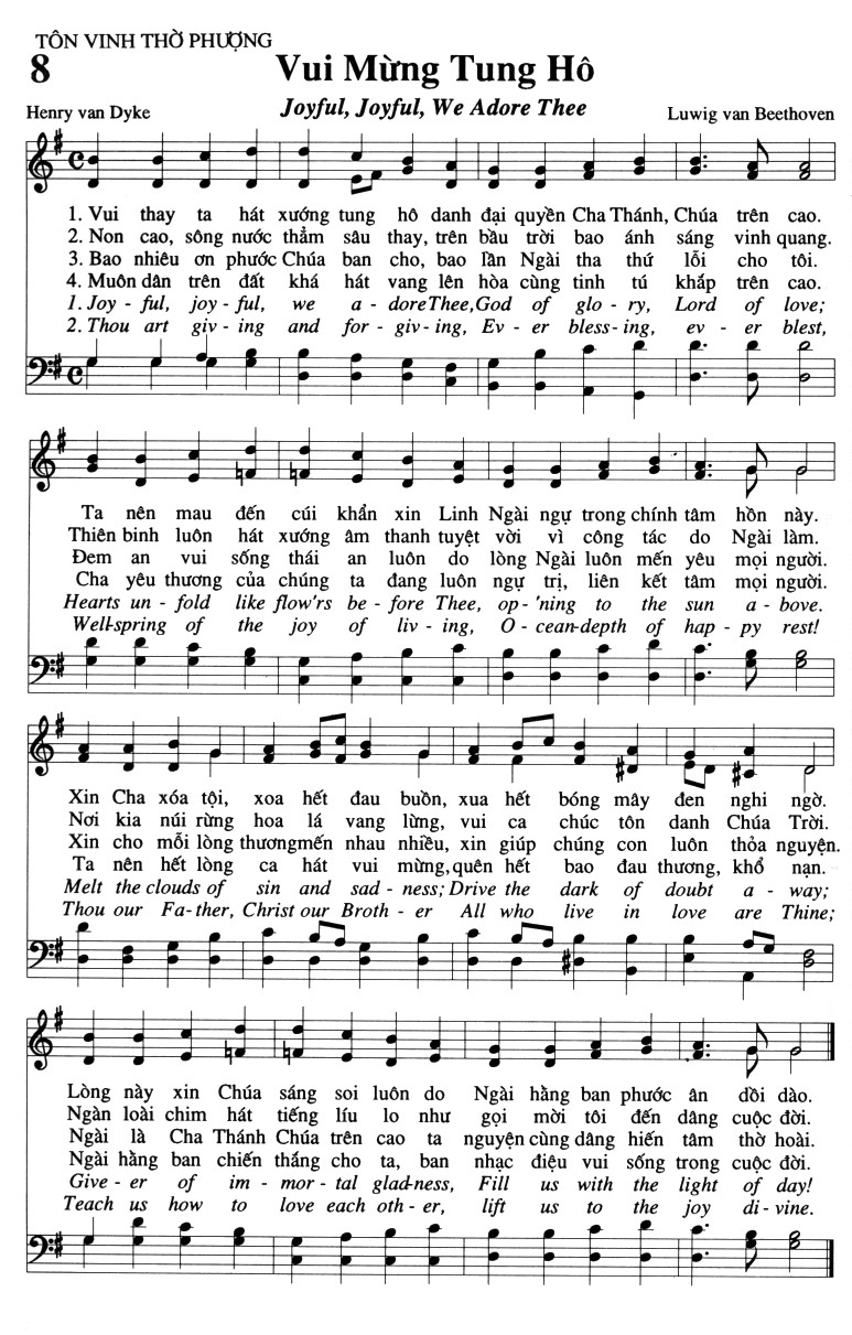 1. Vui thay ta hát xướng tung hô danh đại quyền Cha Thánh, Chúa trên cao. Ta nên mau đến cúi khẩn xin Linh Ngài ngự trong chính tâm hồn này. Xin Cha xóa tội, xoa hết đau buồn, xua hết bóng mây đen nghi ngờ. Lòng này xin Chúa sáng soi luôn do Ngài hằng ban phước ân dồi dào. 2. Non cao, sông nước thẳm sâu thay, trên bầu trời bao ánh sáng vinh quang. Thiên binh luôn hát xướng âm thanh tuyệt vời vì công tác do Ngài làm. Nơi kia núi rừng hoa lá vang lừng, vui ca chúc tôn danh Chúa Trời. Ngàn loài chim hát tiếng líu lo như gọi mời tôi đến dâng cuộc đời. 3. Bao nhiêu ơn phước Chúa ban cho, bao lần Ngài tha thứ lỗi cho tôi. Đêm an vui sống thái an luôn do lòng Ngài luôn mến yêu mọi người. Xin cho mỗi lòng thương mến nhau nhiều, xin giúp chúng con luôn thỏa nguyện. Ngài là Cha Thánh Chúa trên cao ta nguyện cùng dâng hiến tâm thờ hoài. 4. Muôn dân trên đất khá hát vang lên hòa cùng tinh tú khắp trên cao. Cha yêu thương của chúng ta đang luôn ngự trị, liên kết tâm mọi người. Ta nên hết lòng ca hát vui mừng, quên hết bao đau thương, khổ nạn. Ngài hằng ban chiến thắng cho ta, ban nhạc điệu vui sống trong cuộc đời.