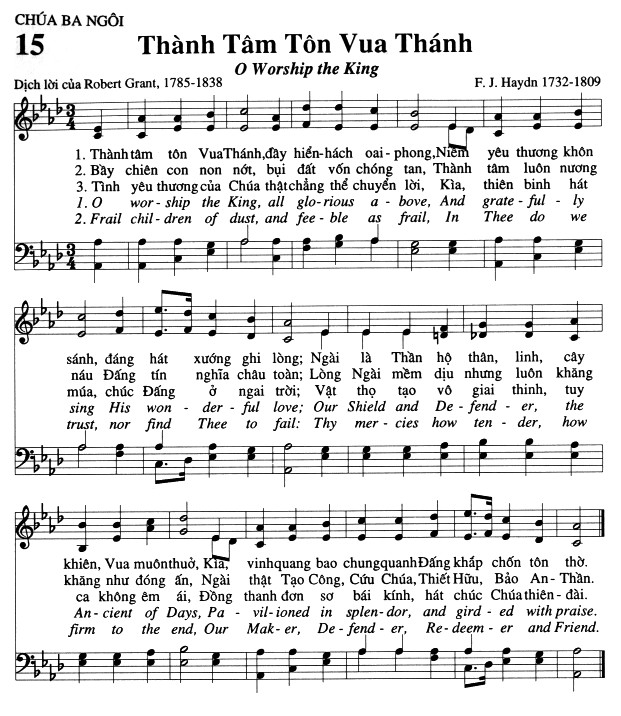 1. Thành tâm tôn Vua Thánh, đầy hiển hách oai - phong, Niềm yêu thương khôn sánh, đáng xướng ghi lòng; Ngài là Thần hộ thân, linh, cây khiên, Vua muôn thuở, Kia, vinhquang bao chung quanh Đấng khắp chốn tôn thờ. 2. Bầy chiên con non nớt, bụi đất vốn chóng tan, Thành tâm luôn nương náu Đấng tín nghĩa châu toàn; Lòng Ngài mềm dịu nhưng luôn khăng khăng như đóng ấn, Ngài thật Tạo Công, Cứu Chúa, Thiết Hữu, Bảo An - Thần. 3. Tình yêu thương của Chúa thật chẳng thể chuyển lời, Kìa, thiên binh hát múa, chúc Đấng ở ngai trời; Vật thọ tạo vô giai thinh, tuy ca không êm ái, Đồng thanh đơn sơ bái kính, hát chúc Chúa thiên - đài.