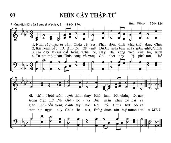 1. Nhìn cây thập tự gẫm Chúa Jêsus, Phải đóng đinh chịu khổ - đau; Chúa ôi, thân Ngài tuôn huyết thắm thay Khổ - hình bởi chúng tôi nay. 2. Kìa, xem bầu trời tăm tối đê mê Đương giữa ban ngày gồm - ghế; Chính trong điện thờ Đức Giê - hô - va Bức màn phải xé hai ra. 3. Tại đây Jê-sus cất tiếng: "Cha ôi, Nay đã xong việc của tôi, Kính giao linh - hồn trong cánh tay Cha". Nói rồi Chúa trút hơi ra. 4. Từ nơi mộ - phần Chúa sống vẻ vang, Cõi chết nay bị phá - tan, Bê then địa - ngục duy Chúa Jê - sus, Đấng được tán - mỹ muôn thu. A-MEN.