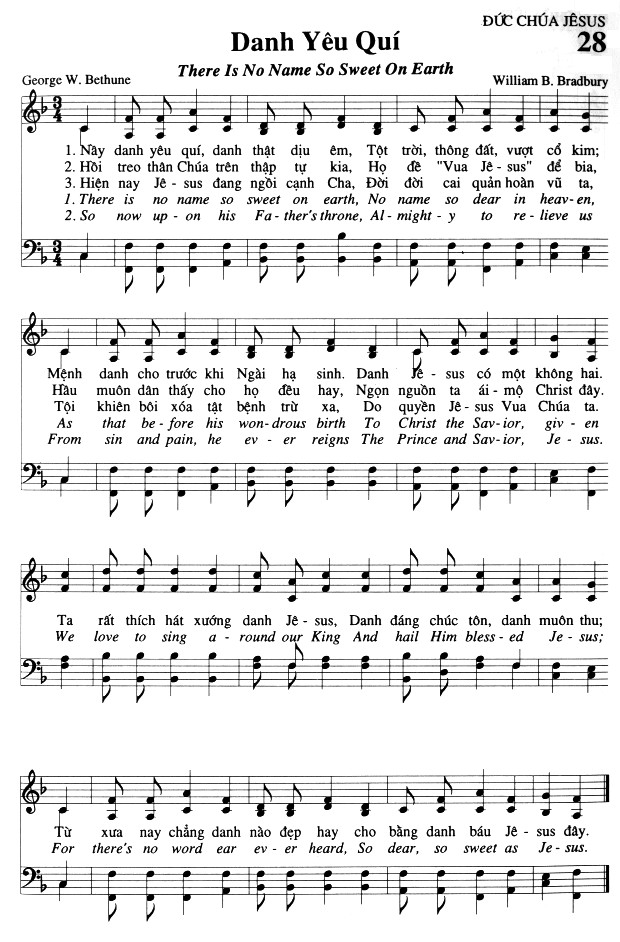 1. Này danh yêu quí, danh thật dịu êm, Tột trời, thông đất, vượt cổ kim; Mệnh danh cho trước khi Ngài hạ sinh. Danh Jêsus có một không hai. 2. Hồi treo thân Chúa trên thập tự kia, Họ đề "Vua Jêsus" để bia, Hầu muôn dân thấy cho họ đều hay, Ngọn nguồn ta ái mộ Christ đây. 3. Hiện nay Jêsus đang ngồi cạnh Cha, Đời đời cai quản hoàn vũ ta, Tội khiên bôi xóa tật bệnh trừ xa, Do quyền Jêsus Vua Chúa ta. Điệp khúc: Ta rất thích hát xướng danh Jêsus, Danh đáng chúc tôn, danh muôn thu; Từ xưa nay chẳng danh nào đẹp hay cho bằng danh báu Jêsus đây.